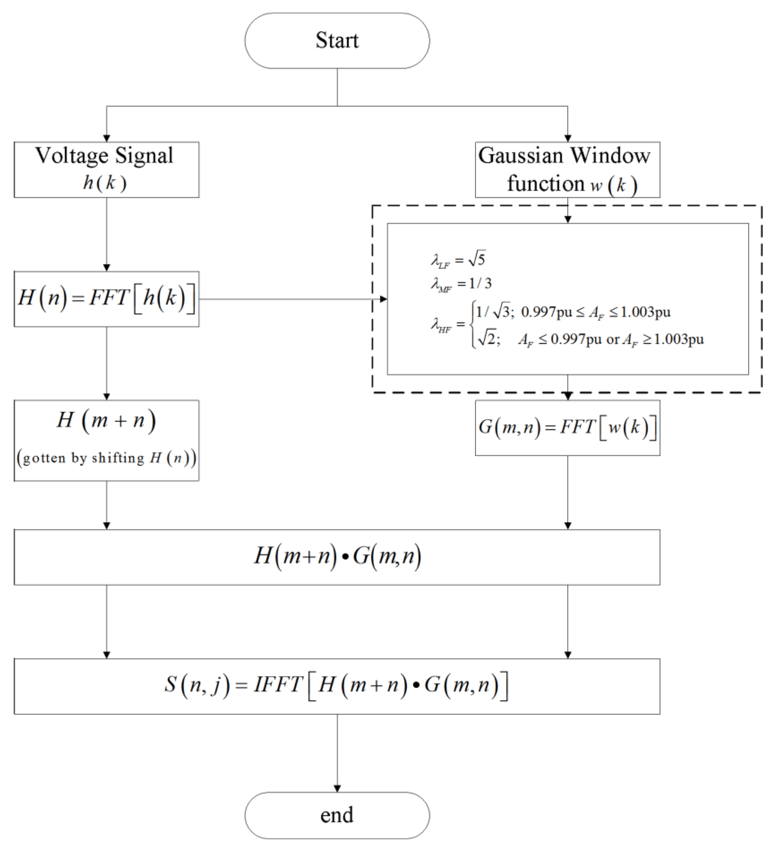 Different frequency components of the non-stationary signal with distortion will produce different time-frequency distribution characteristics, whereby the high frequency area of a signal changes dramatically, and the low frequency area has a relatively stable change [18]. It is necessary to adjust the window width of the Gaussian window according to the signal analysis requirement, that is, a wider time window in the high frequency area while are more narrow time window can be used in the low frequency area. The width of the S-transform window will be invariant after confirmation of the window function, thus its application is limited and some scholars have thus put forward a generalized S-transform [10], with the width factor of window function , that is, making . With the adjustment of the value , the variation rate of width of window varies and the Gaussian window function is expressed as: