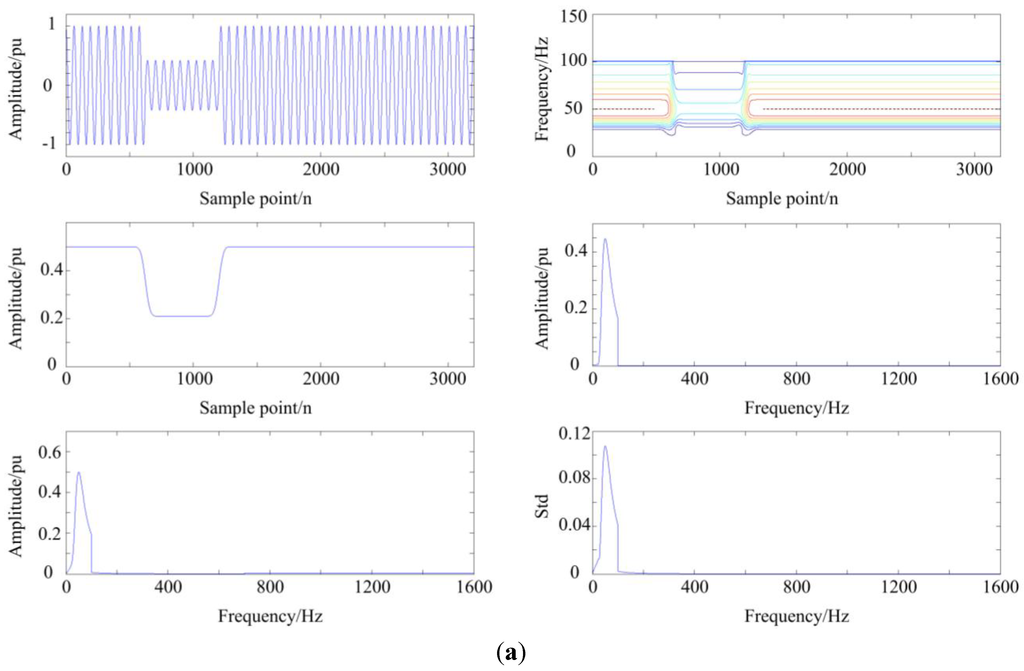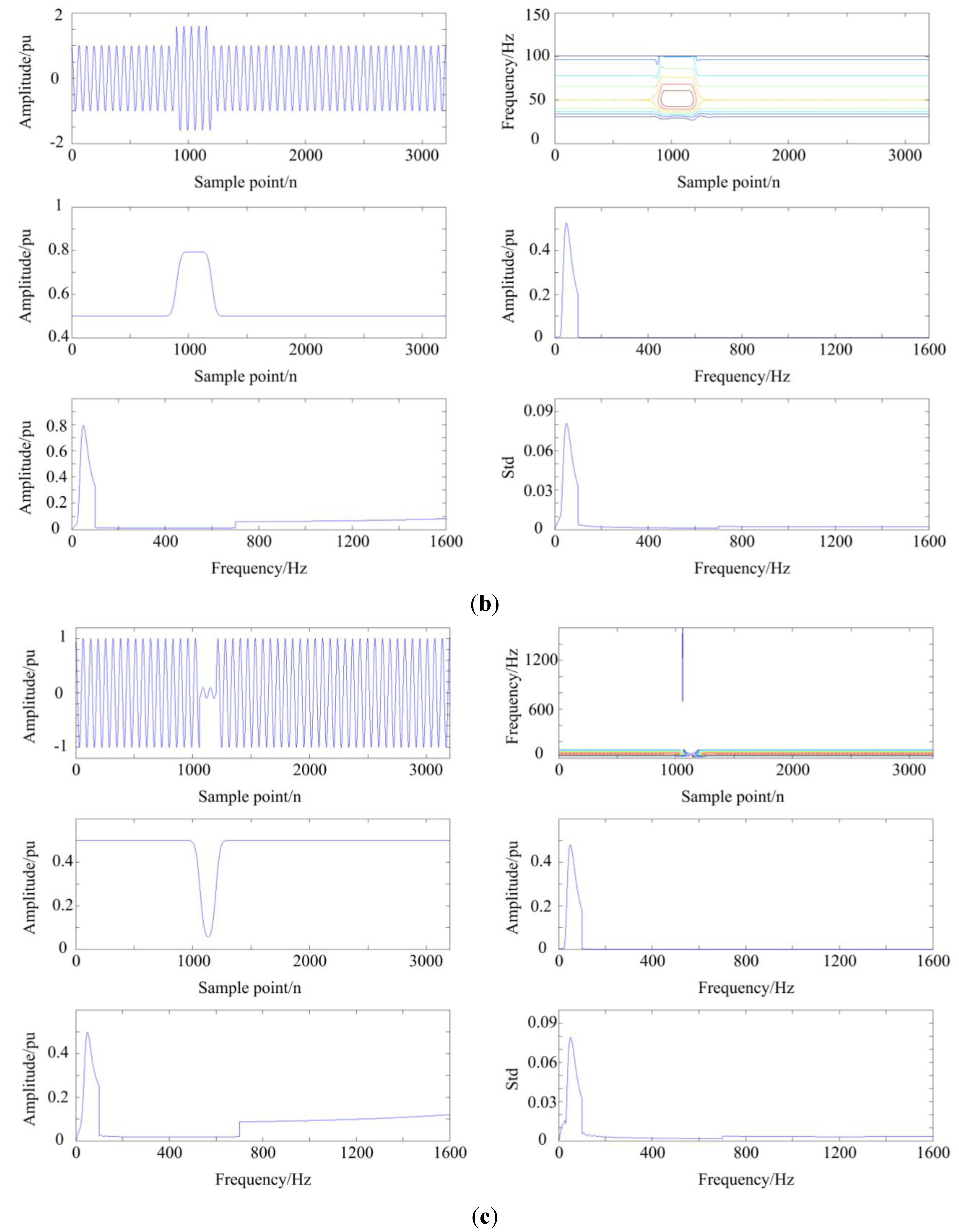 The setting of the width factor in the high frequency area aims to reflect the transient component feature. Interruption and sag distribute in the whole frequency range, whose energy changes dramatically near the edge of distortion, so they may be mistakenly identified as the signal containing a transient disturbance. At the same time, a signal with noise may be identified as the signal containing a transient component. However, the requirements in these two cases are different obviously. On the one hand, we should maintain the high frequency energy of the transient to distinguish between sag, interruption and the transient disturbances. In this case, MGST need a higher time resolution. On the other hand, higher frequency resolution is needed to suppress any noise. Therefore, for the width factor in the high frequency area, MGST gives an adaptive setting. Based on the analysis of the fundamental frequency through the Fourier spectrum (), we can judge whether the signal contains a fundamental frequency disturbance (sag or interruption). In this paper, when ( represents per unit), we decide that there is no fundamental frequency disturbance and make ( represents of high frequency); otherwise, there exists a fundamental frequency disturbance and . In this way, by adaptively adjusting the width factor in the high frequency area we can meet different requirements of the window width in different situations.