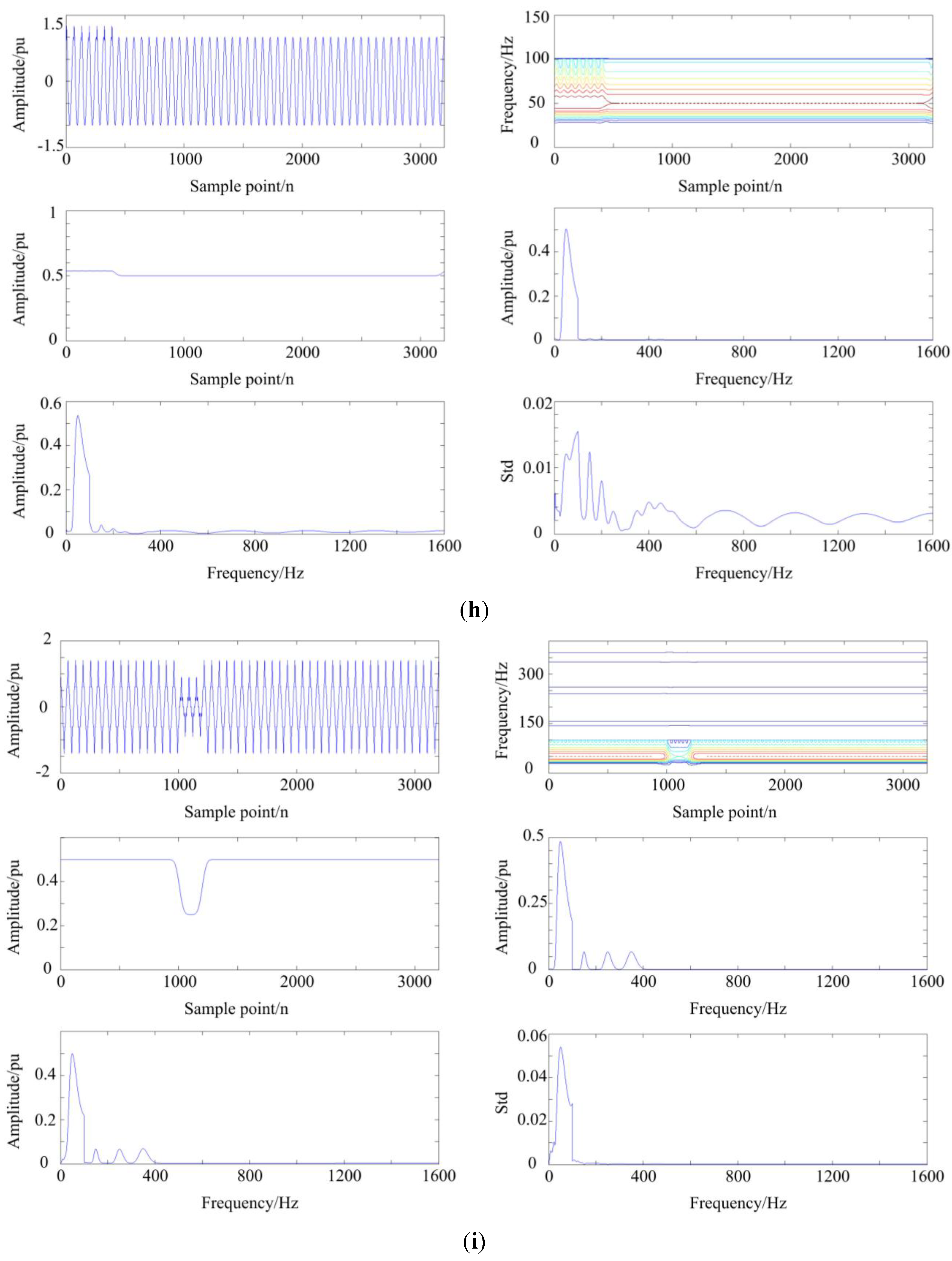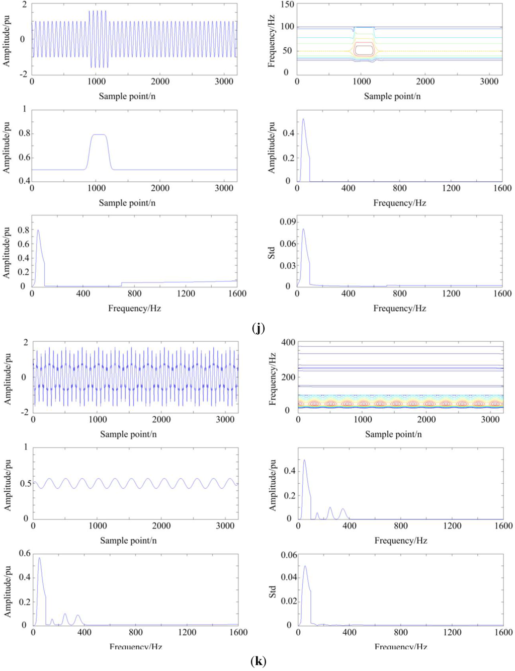 The MGST analysis of 13 disturbances: (a) sag; (b) swell; (c) interruption; (d) flicker; (e) transient; (f) harmonic; (g) notch; (h) spike; (i) harmonic with sag; (j) harmonic with swell; (k) harmonic with flicker; (l) harmonic with transient; (m) sag with transient.