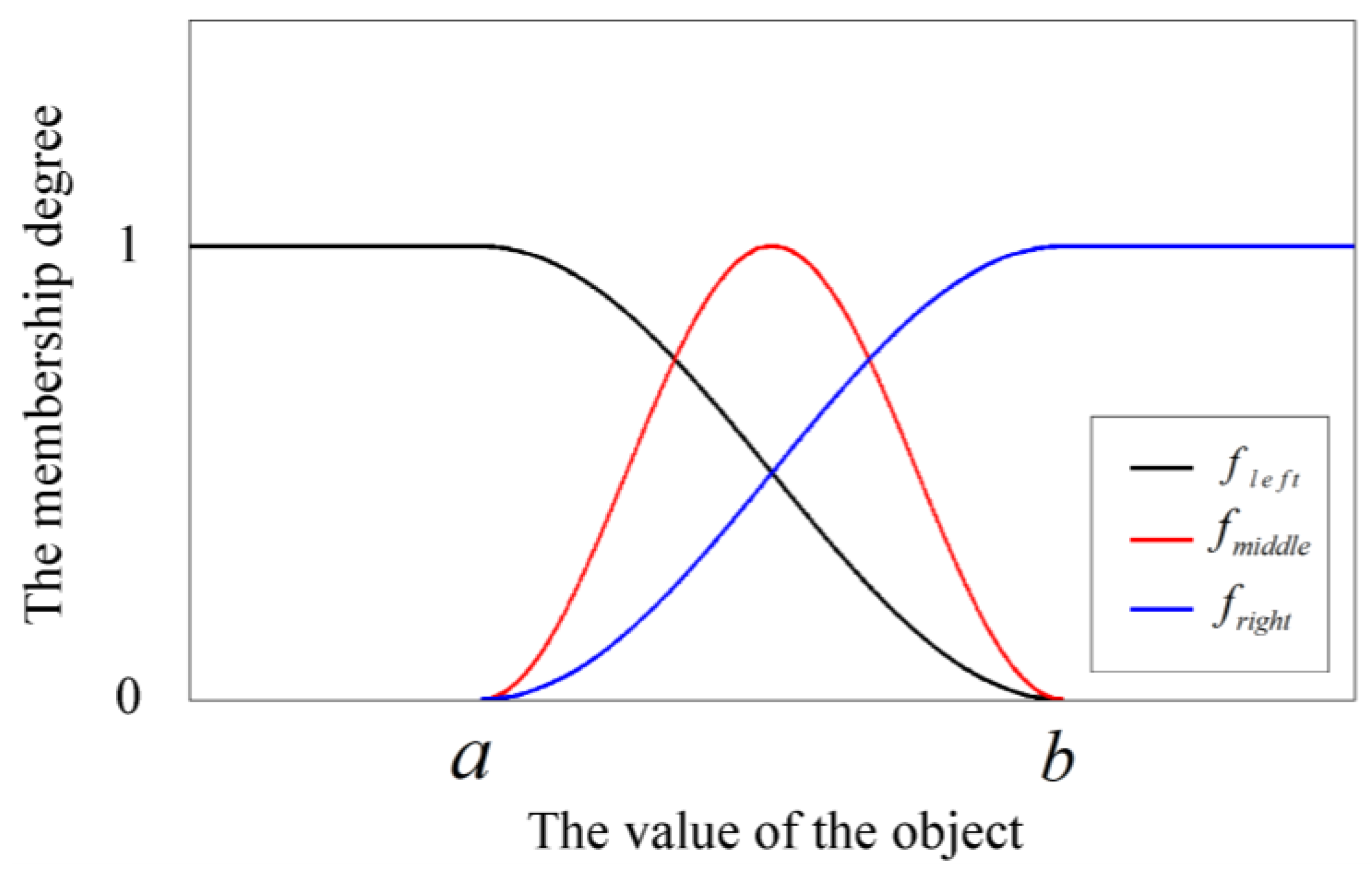 In Equation (20), and are decided by the specific problem. It is necessary to confirm or estimate their values. Three membership functions (left, middle and right) are presented as Equations (21)–(23) to provide the inputs corresponding to the three fuzzy sets: LOW, MEDIUM and HIGH where and are parameters determined by the practical problems. The curves of the membership functions are shown in Figure 7: