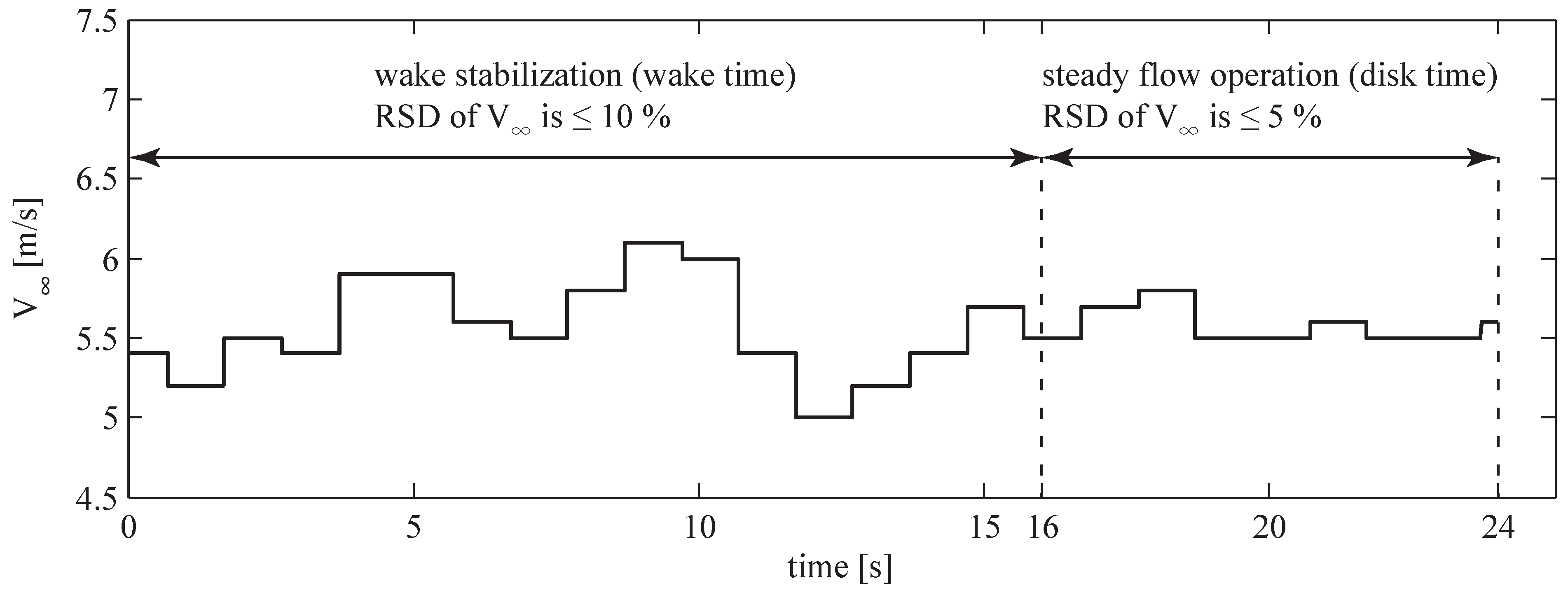 The measured data were divided into 24 s-long bins: 16 s to stabilize the turbine wake (“wake time”, corresponding to 10 revolutions at 40 rpm) followed by 8 s of steady flow operation (“disk time”, 5 revolutions at 40 rpm). Wind flow was considered as steady for bins with the RSD of the asymptotic wind velocity of , and the RSD of wind direction of . This definition of the steady wind flow conditions is documented in [18]. Variations of the wind speed during the steady conditions are illustrated in Figure 4.