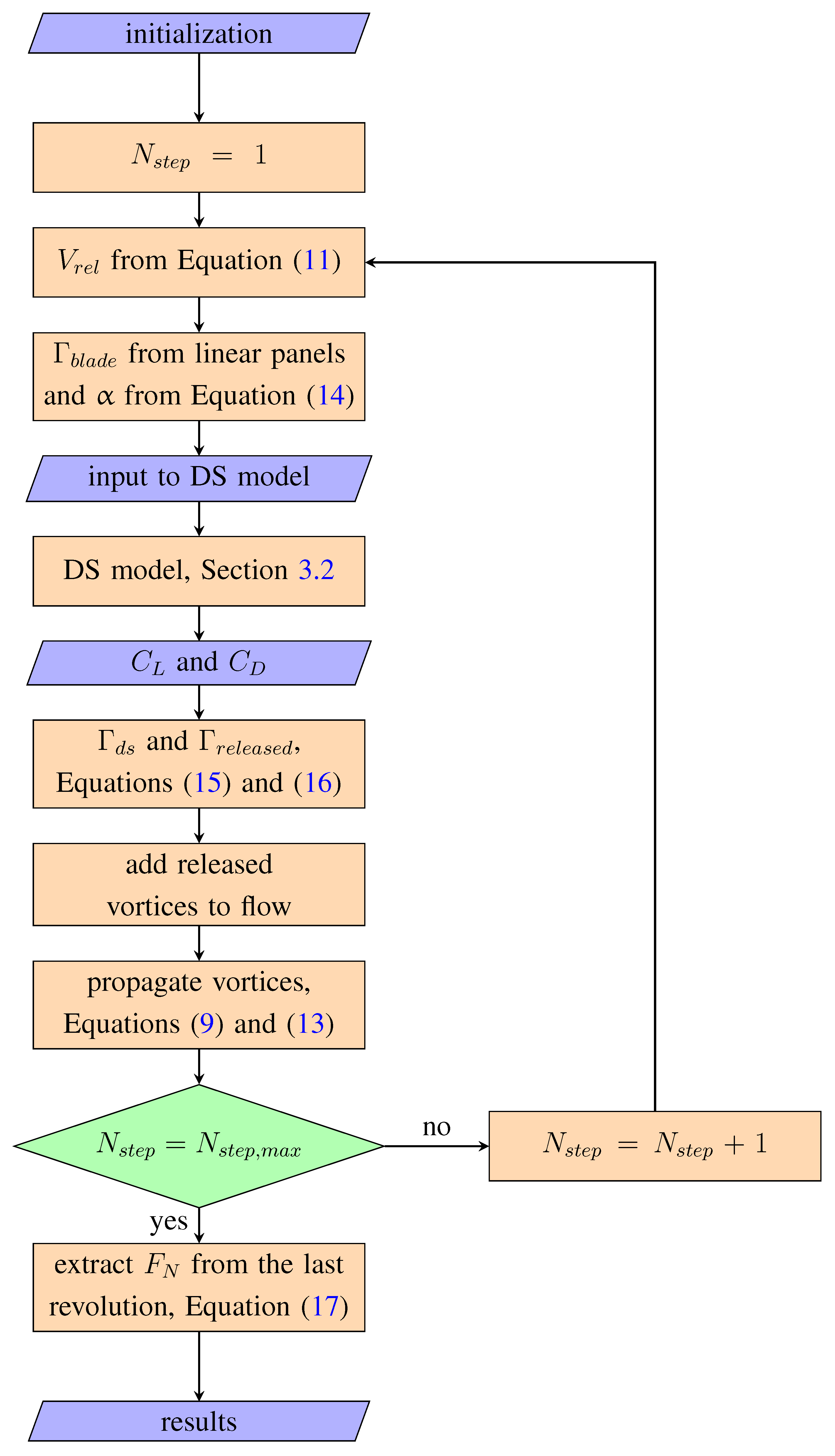 Flow chart of the vortex model combined with the dynamic stall (DS) model. is the current time step, and is the maximum number of time steps. , corresponding to 120 time steps per each of 100 revolutions.