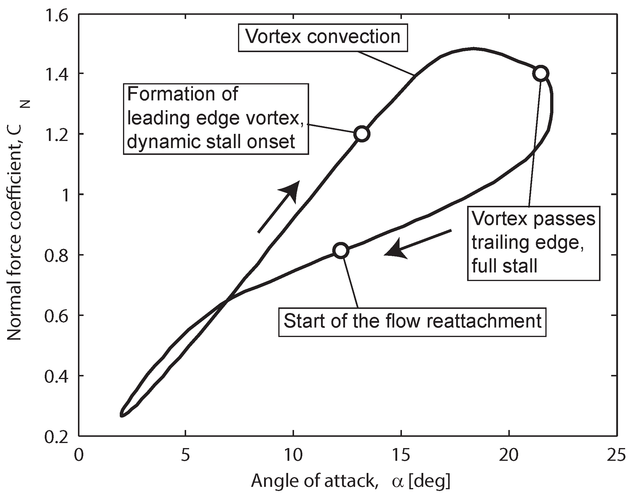 An example of the force response during the pitching motion of an airfoil is shown in Figure 7, and the features mentioned above are noted. The tangential force coefficient needs to be estimated in order to find the lift and drag coefficients. The calculation of is based on Kirchhoff’s approximation, and the dynamic separation point is used: