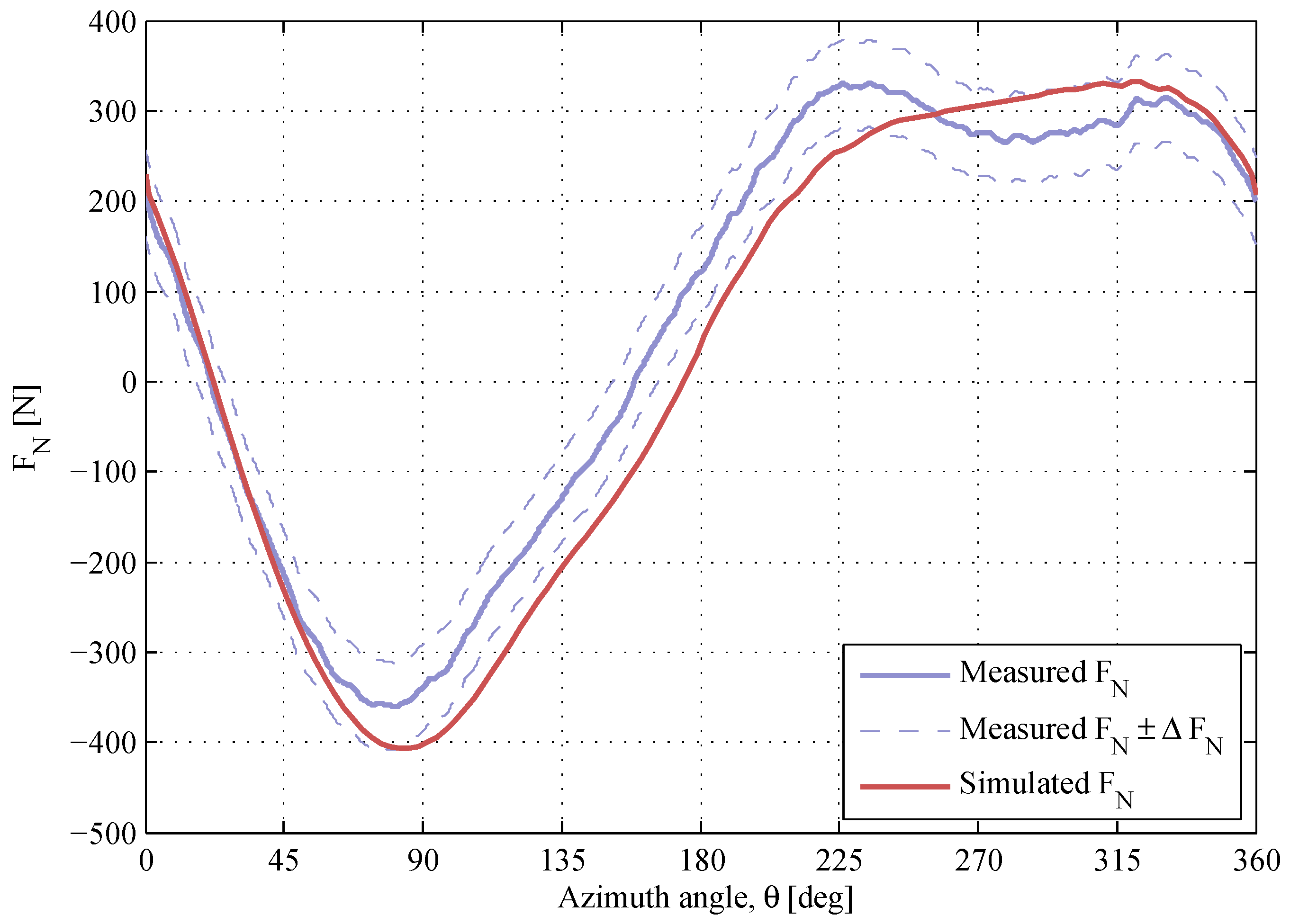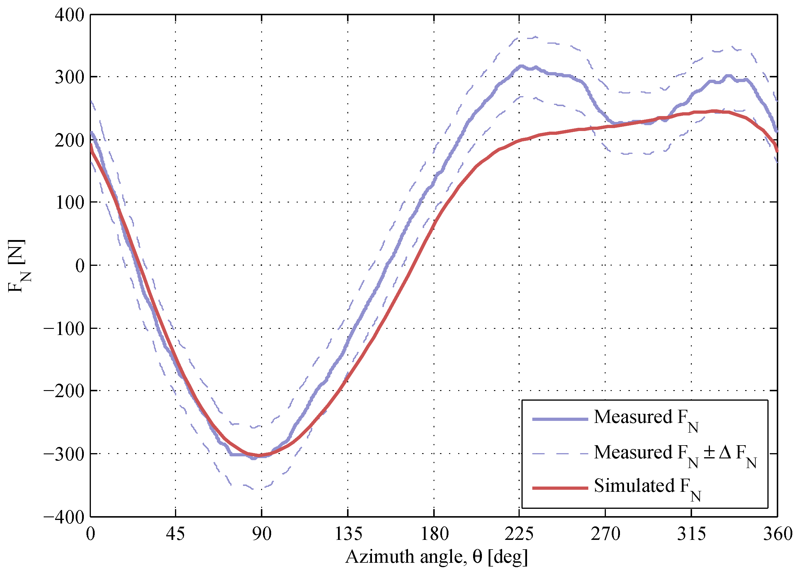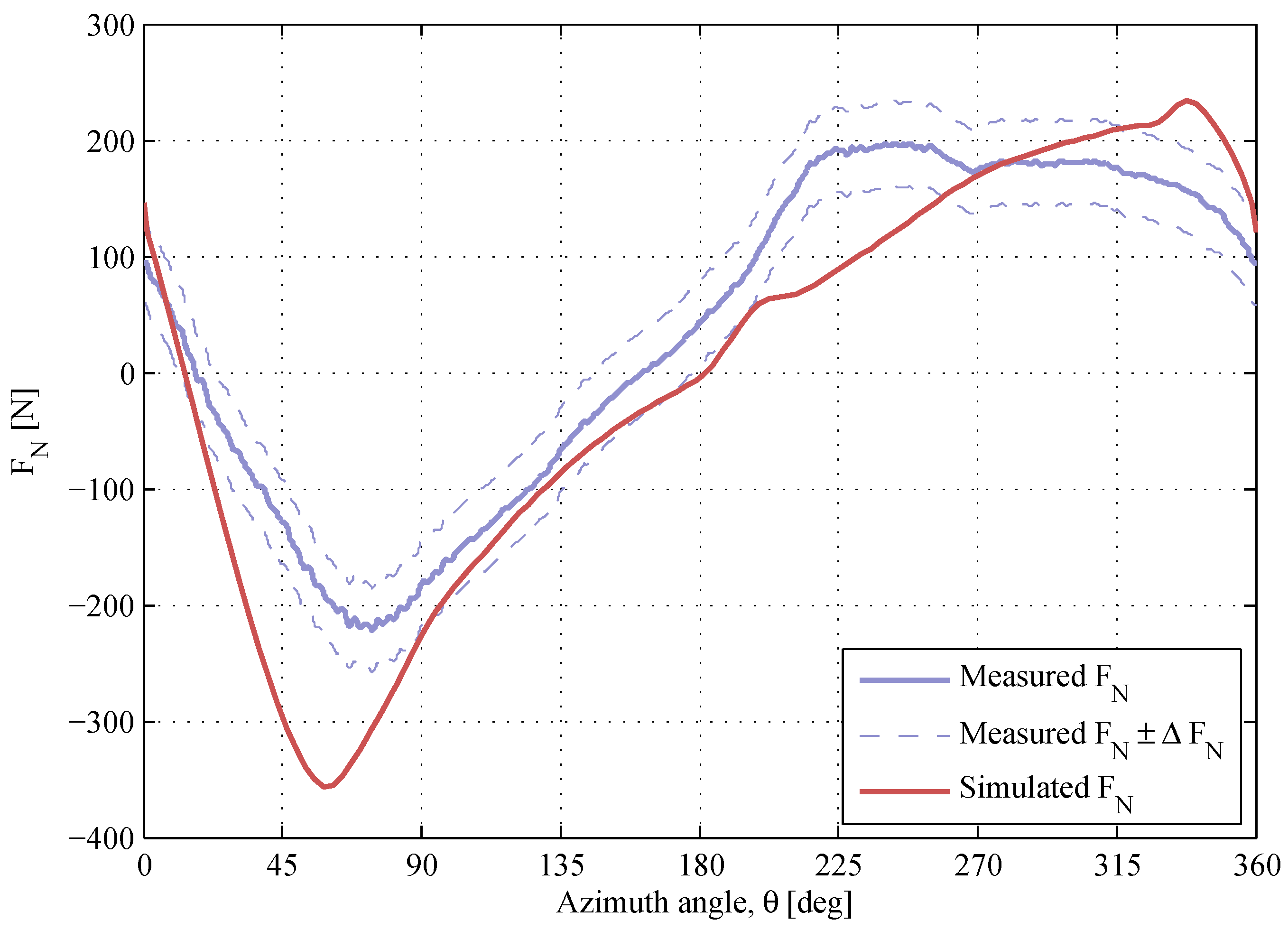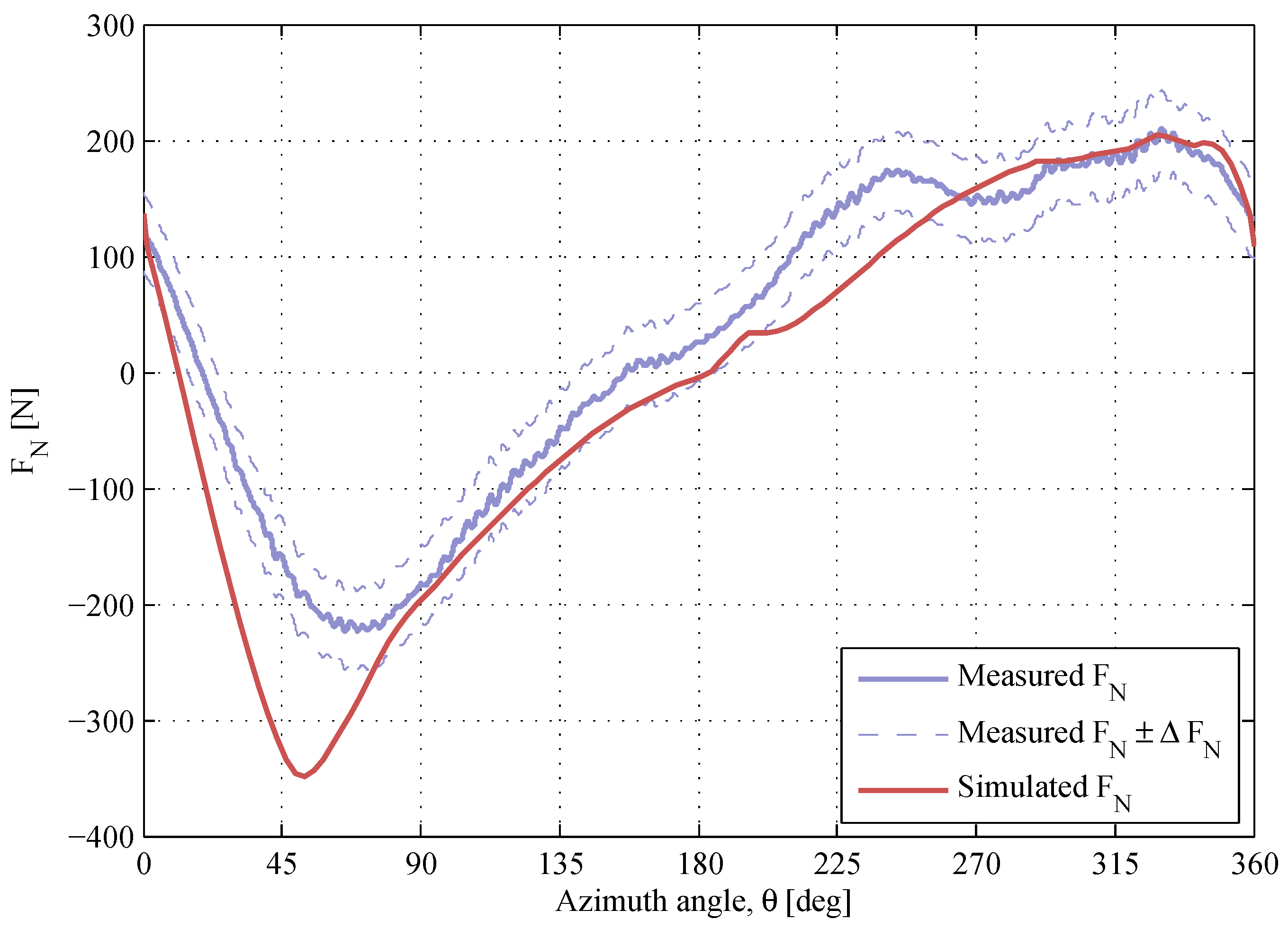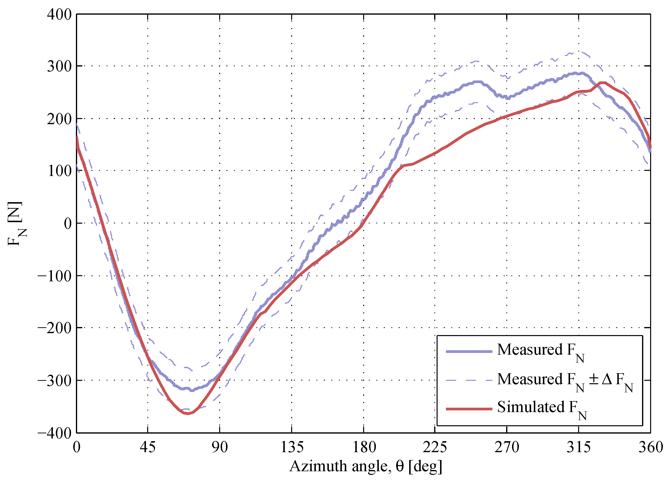 The maximum measurement error is estimated for every -curve using Equation (5). Due to the high repeatability of the measured normal force, the shape of the -curve is likely to remain, though the measurement error can change the scale of the -response. This is observed when comparing two sets of data at almost identical operational conditions; Figure 16. Therefore, the measurement error has to be considered throughout the assessment of the simulation model.