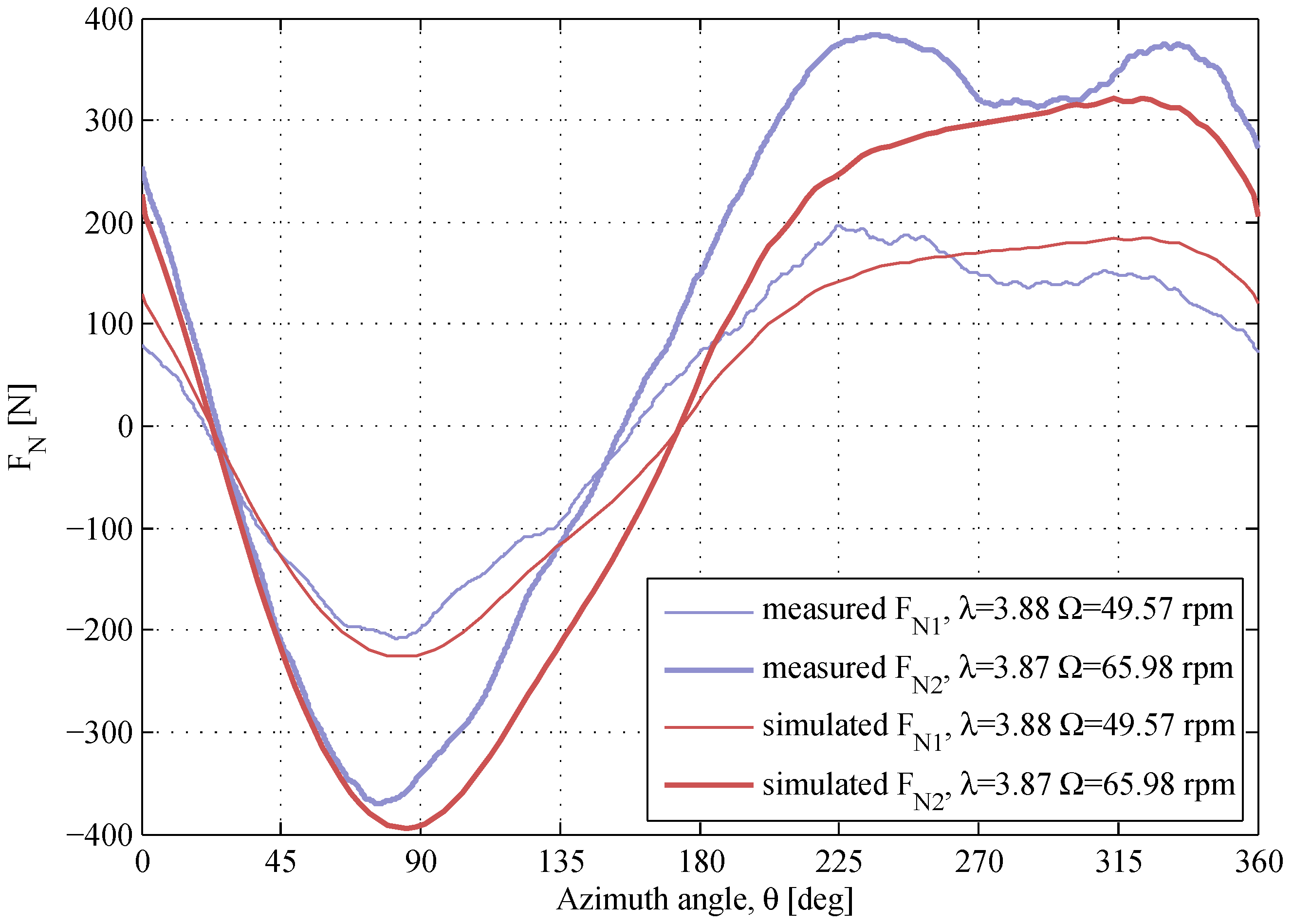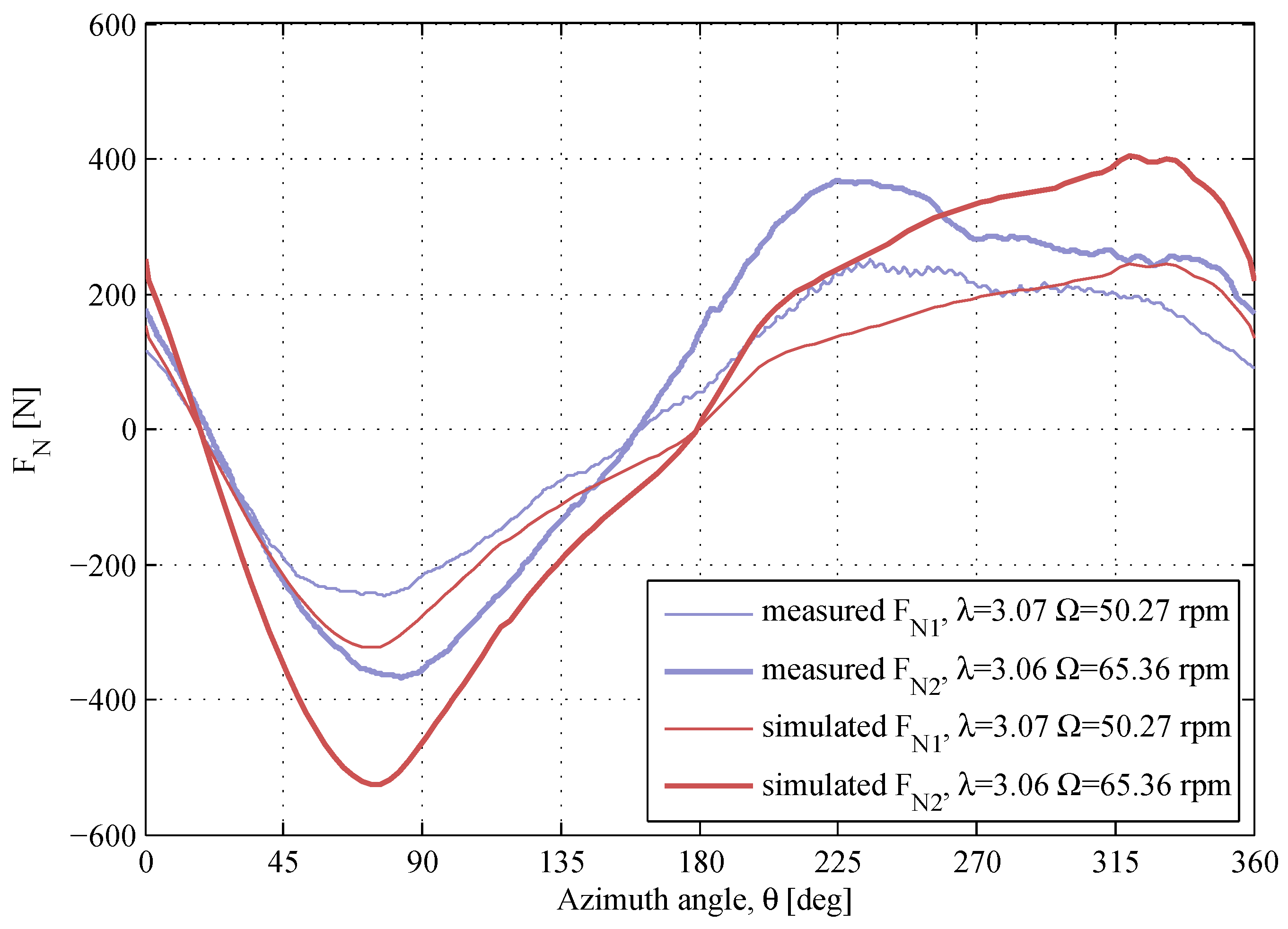 The normal force during one revolution is obtained as the average response over 5 revolutions with steady wind flow. The operational TSR is estimated as: