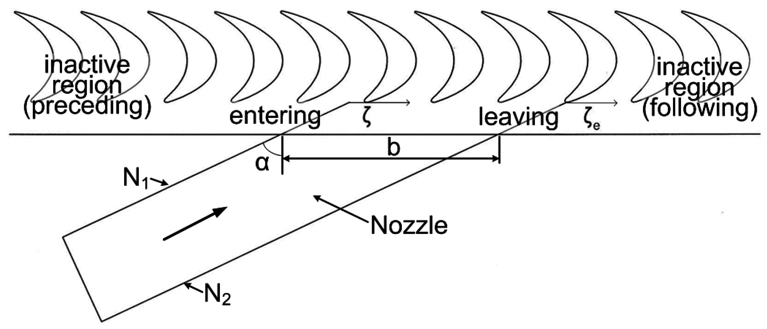 The linear cascade apparatus used for the partial admission experiments consisted of impulse-type blades and a nozzle, as shown in Figure 1. The cross section of the nozzle is rectangular, and its size is 200 mm × 200 mm. The chord of the cascade blade is 200 mm, and the stagger angle is 10.52°. An experiment was conducted at a Reynolds number of 3 × 105 based on the chord. The operating air was supplied from an open-type wind tunnel of 30 kW. Not only the exit but also both sides of the linear cascade apparatus were open to the atmosphere for the simulation of blades rotated across the admission region in the circumferential direction. In Figure 1, “b” means the width of the admission region, “α” is the nozzle flow angle, “N1” and “N2” are sidewalls of the nozzle, and “ζ” means the non-dimensional length divided by the width of the admission region. In the experiment, nine blades were installed in each inactive region at the side of the admission region in order to obtain the same operating conditions as those of the partial admission operation. The cascade can be moved to simulate the position of a rotor blade across and beyond the admission region to simulate the flow field of the rotating frame under quasi-steady state flow conditions.