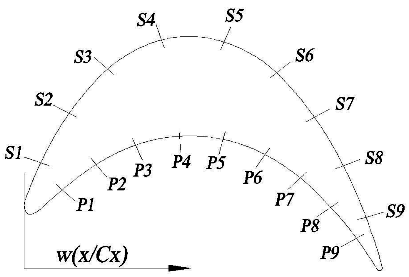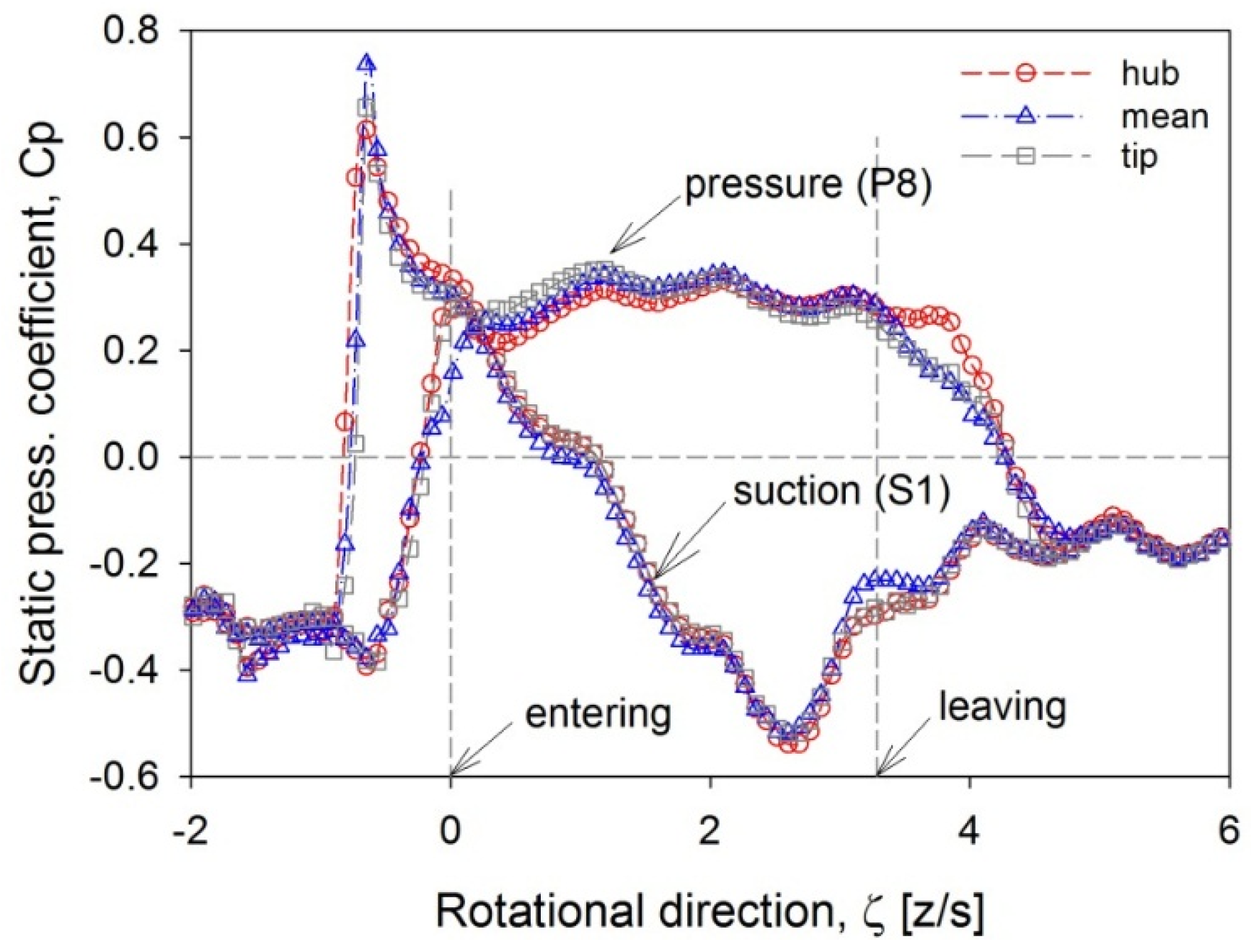 Variation of static pressure coefficient on the suction (S1) and pressure surfaces (P8).