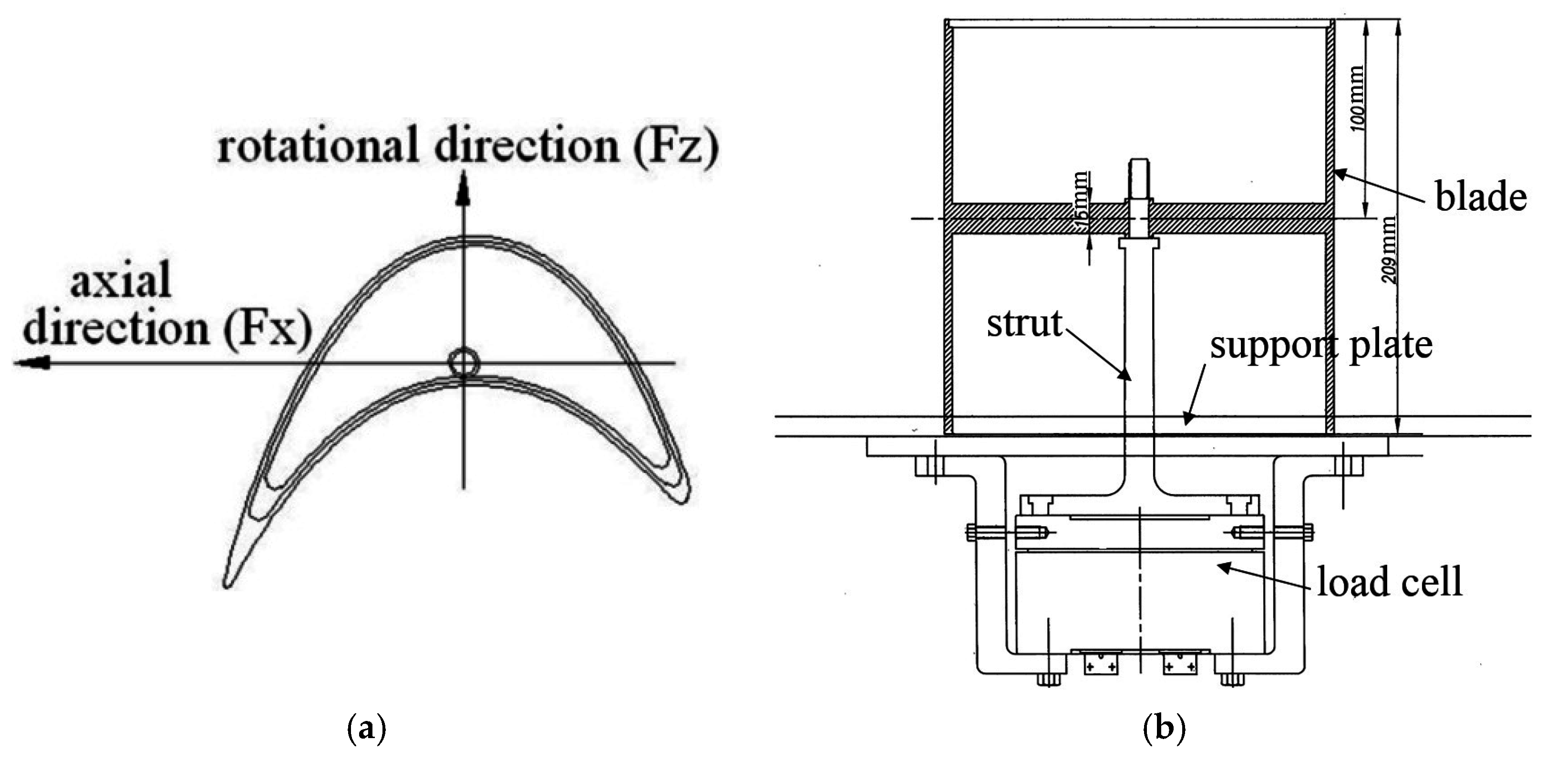 Forces on a blade were measured using a two-axis load cell for both the rotational direction and the axial direction. The rotational direction is similar to the circumferential direction because the experiment was conducted on a linear cascade. The load cell was precisely manufactured not to interfere with either directional force. Its specifications are shown in Table 2. In the experiments, this load cell was connected to a blade using a strut as shown in Figure 3.