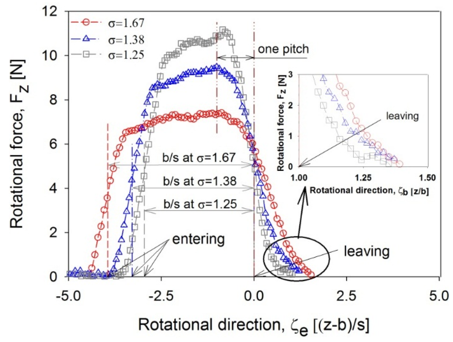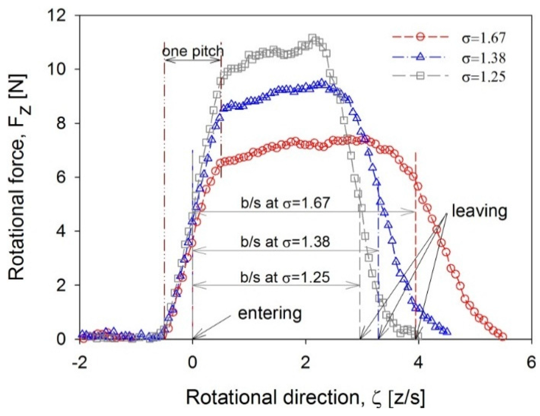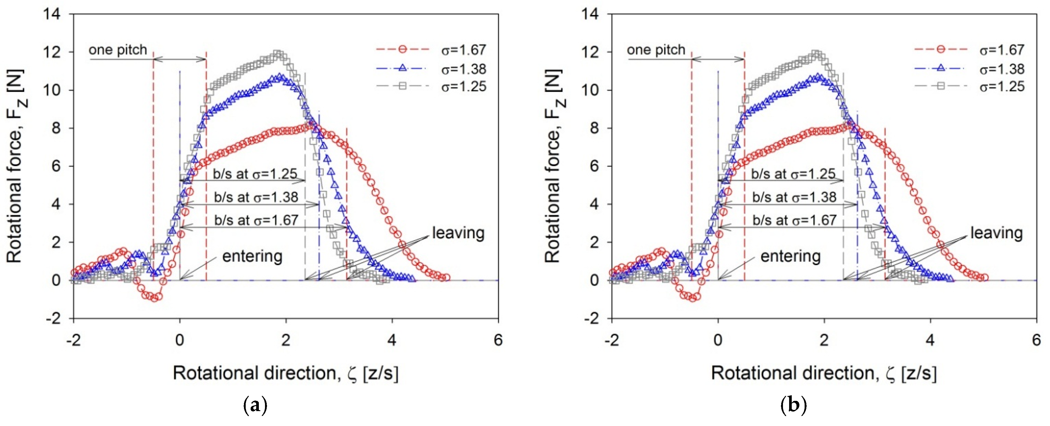 Figure 6 shows the variation in the rotational forces when the blade approaches the end of the admission region, i.e., the leaving location. Despite the different solidities, the rotational forces always began to decrease at about the same location within one pitch prior to the leaving location. However, in the following inactive region, these rotational forces completely decayed at different ζ-locations, even though they began to weaken at the same location. This result means that the decaying distance of the rotational force is not related to the pitch (s), but to the expansion width of the nozzle flow. When the abscissa is re-drawn based on the admission region (b) instead of the pitch (s), the rotational forces all completely disappear at virtually the same location, as shown in the small figure in the right-hand corner.