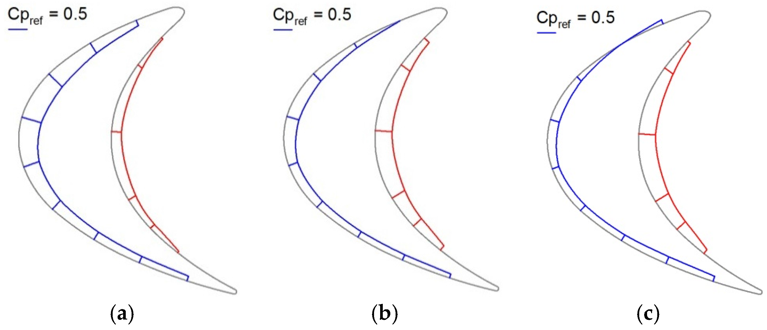 where Pt and Ps in Equation (2) represent the total pressure and the static pressure, respectively. The subscripts “in” and “local” indicate the location at the nozzle inlet and on the blade surface, respectively. Figure 8 shows the static pressure distribution on the blade for the three different solidities at the mean, and also it shows the reference length for the magnitude of the static pressure coefficient at Cp = 0.5. The experimental results show that the axial force is produced mainly by the pressure on the suction surface. Meanwhile, the pressure on the pressure surface has only a slight influence on the axial force because pressure towards the axial direction cancels itself out. The blade row with the largest solidity showed substantial pressure on the suction surface of the fore blade. Hence, the largest axial force was obtained on the cascade having σ = 1.67 at the entering location.
