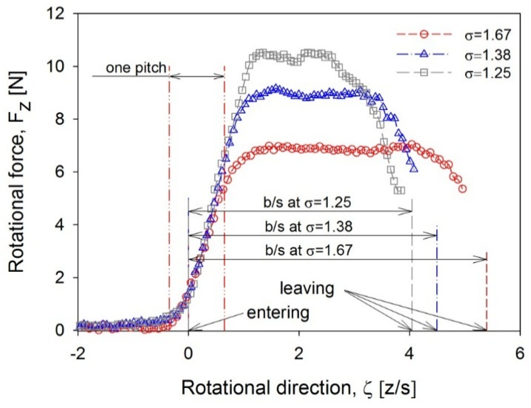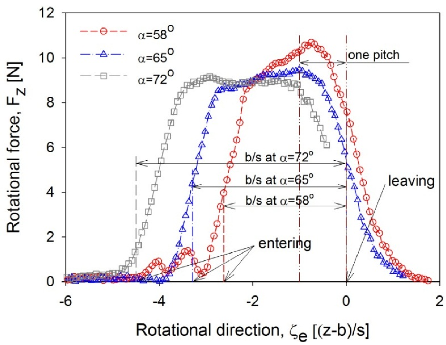 In the expansion of the nozzle flow in the following inactive region, the nozzle flow was slightly influenced by the flow absorbed from the surrounding region because the flow direction of the absorbing stream was nearly opposite to that of the nozzle flow. Thus, the expanded region decreased when the nozzle flow angle was reduced. This reduced expansion region reduced the effect of the expansion when the blade approached the leaving location. Figure 16 shows the rotational force measured at α = 58° compared with those measured with two different nozzle flow angles. The experiment was conducted at the same solidity of σ = 1.34 and the rotational forces were redrawn based on the leaving location. For a smaller nozzle flow angle, the maximum rotational force was maintained for a longer distance even though the blade entered within a distance of one pitch ahead of the leaving location.