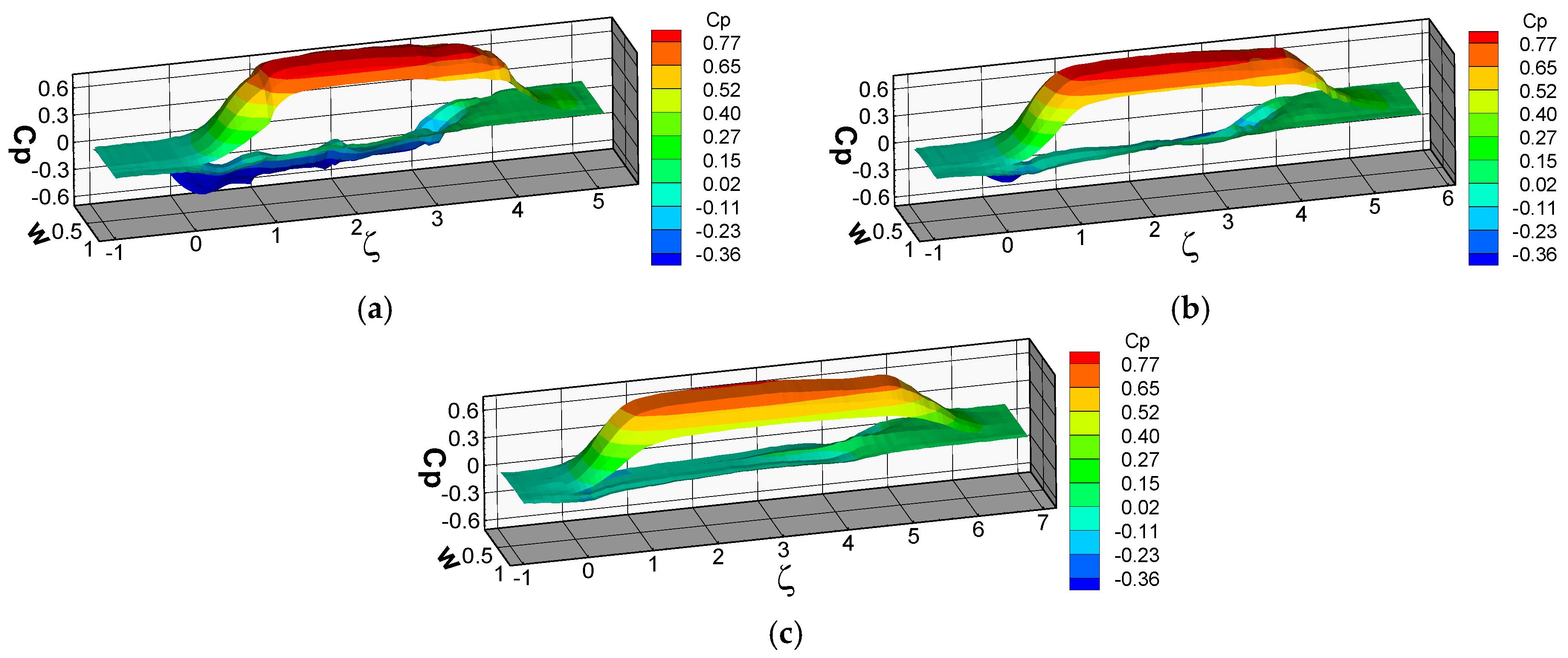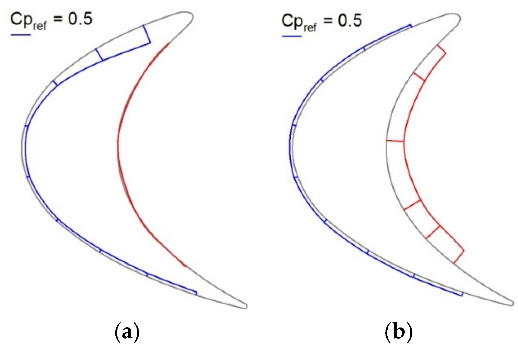 Pressures on the blade surface were measured at the entering location, where the maximum axial force was obtained. These pressures were converted to the static pressure coefficient, as defined in Equation (2):