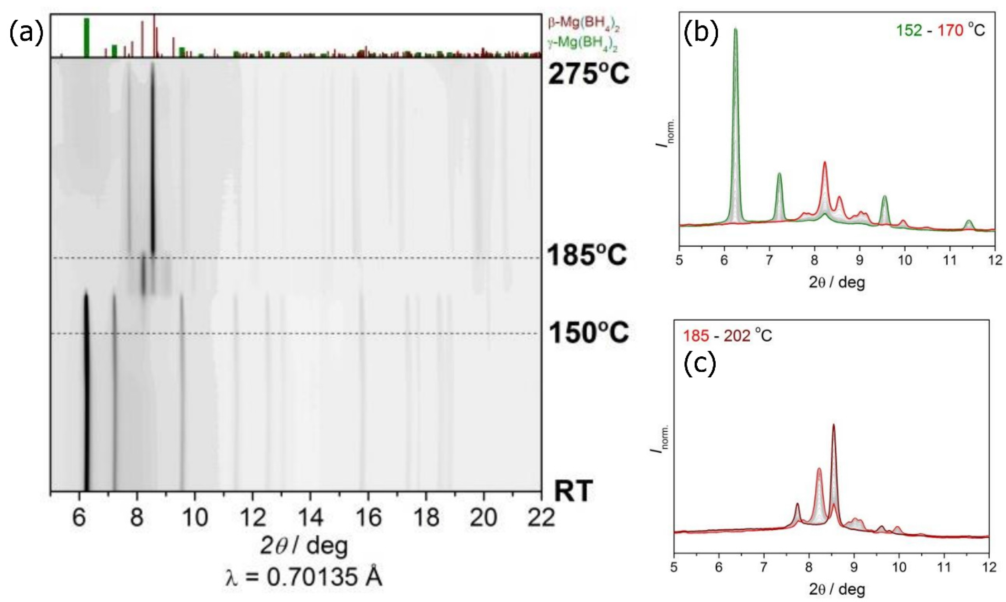 (a) In-situ synchrotron radiation powder X-ray diffraction (SR-PXD) of milled γ-Mg(BH4)2 obtained by heating the sample from room temperature (RT) to 285 °C at 5 °C/min and 2.5 bar H2. Detailed view: (b) γ → ε; and (c) ε → β′ phase transitions in γ-Mg(BH4)2.