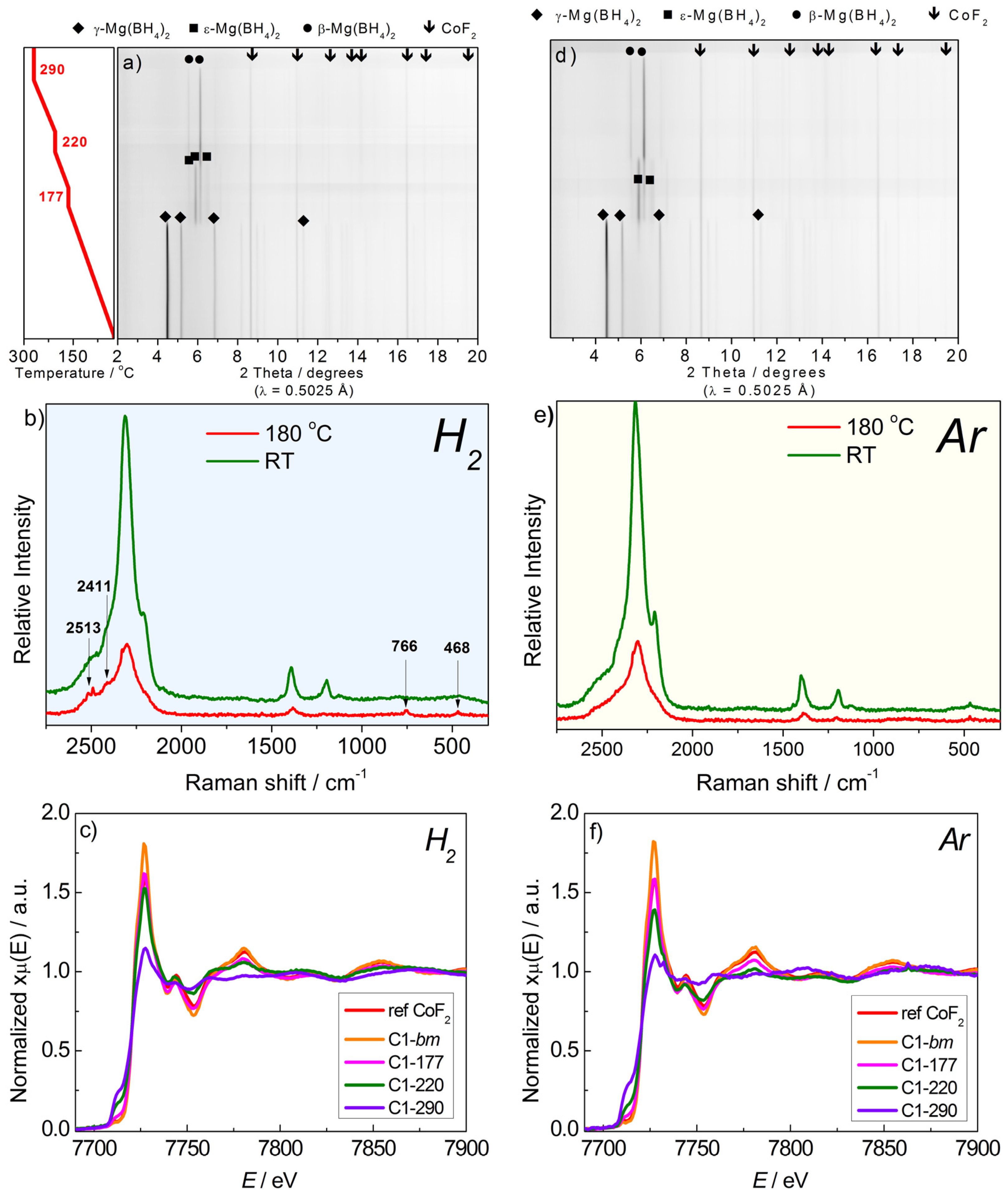 In-situ characterization using (from top to bottom) SR-PXD, Raman and X-ray absorption (XAS) spectroscopies of the thermal decomposition of Mg(BH4)2 + 2 mol% CoF2 (C1 sample) in the RT-300 °C range in two different annealing environments: (a–c) 2.5 bar H2; and (d–f) 1 bar Ar.