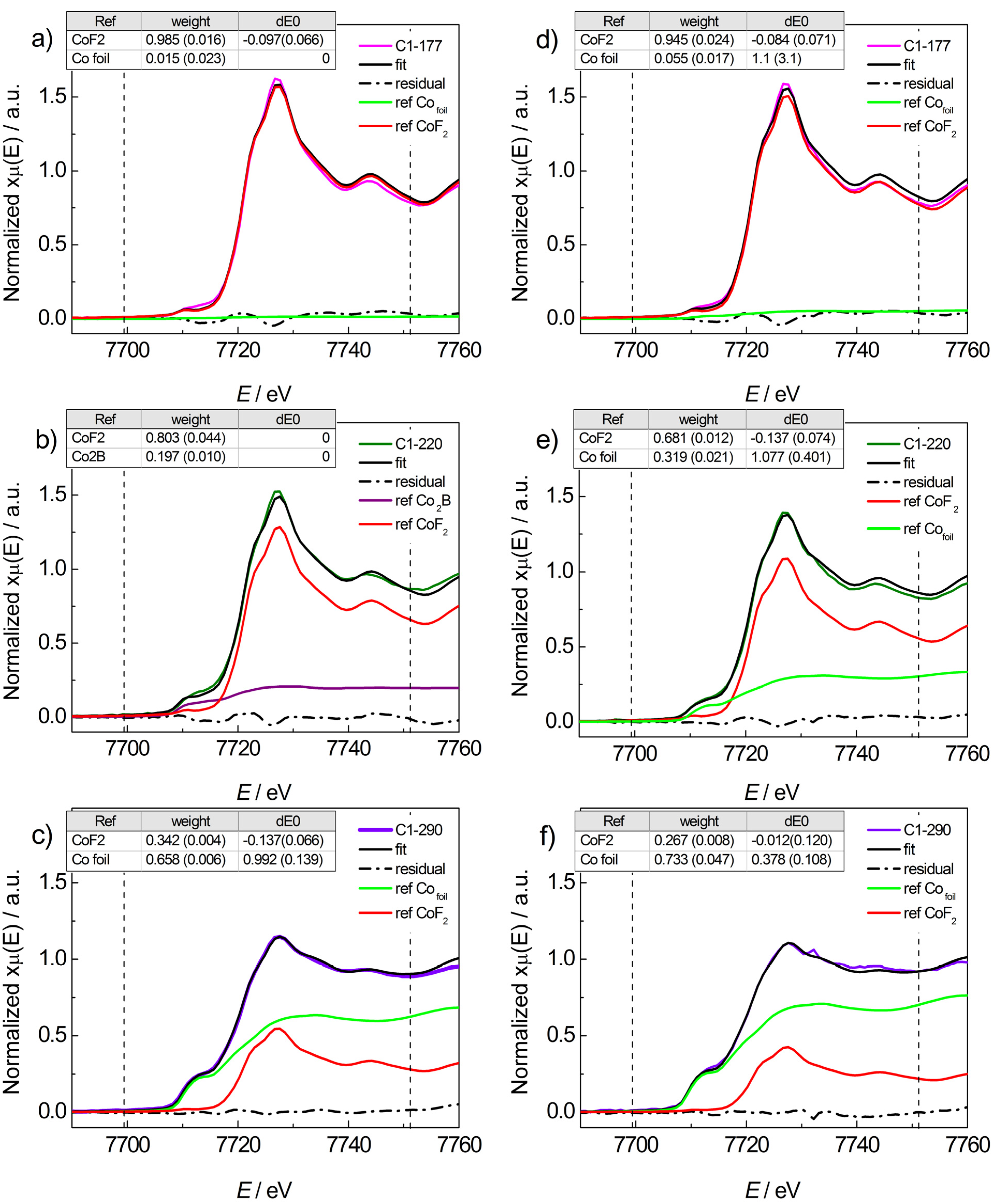 Linear combination fitting (LCF) of C1-H2 (a–c) and C1-Ar (d–f) XAS spectra recorded (from top to bottom) at 177 °C, 220 °C and 290 °C using CoF2, Co, and Co2B as references. All combinations of the three references were used in the fit, with the weight sum set to 1; the edge energy parameter, E0, was freed and ΔE0 denotes its shift after fitting. The fit range is shown by vertical dashed lines. The errors are indicated in parenthesis.