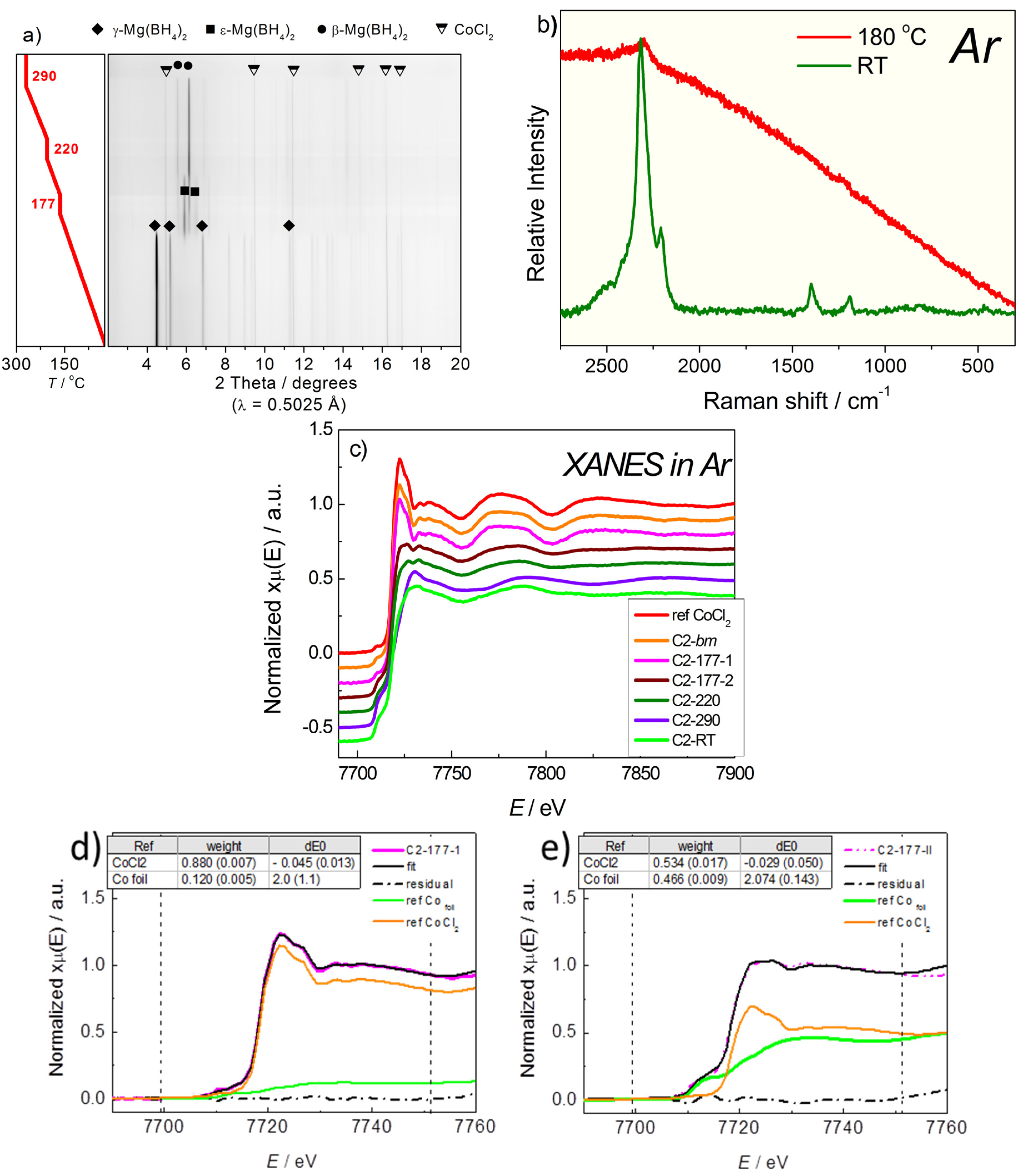In-situ characterization of the thermal decomposition of Mg(BH4)2 + 2 mol% CoCl2 in Ar in the RT-290 °C range. (a) SR-PXD at increasing T; (b) Raman spectra at RT (green) and at 180 °C (red); (c) Co K-edge XAS spectra of CoCl2 reference (at RT) and C2 recorded at different temperatures and at RT after the measurements (light green). XAS spectra are y-offset for clarity. LCF of C2-Ar with CoF2, Co, and Co2B references: at 177 °C (d) and after 5 min at 177 °C (e). All combinations of the three references were used in the fit with the weight sum set to 1; the E0 parameter was freed. The fit range is shown by dashed lines. The errors are indicated in parenthesis.