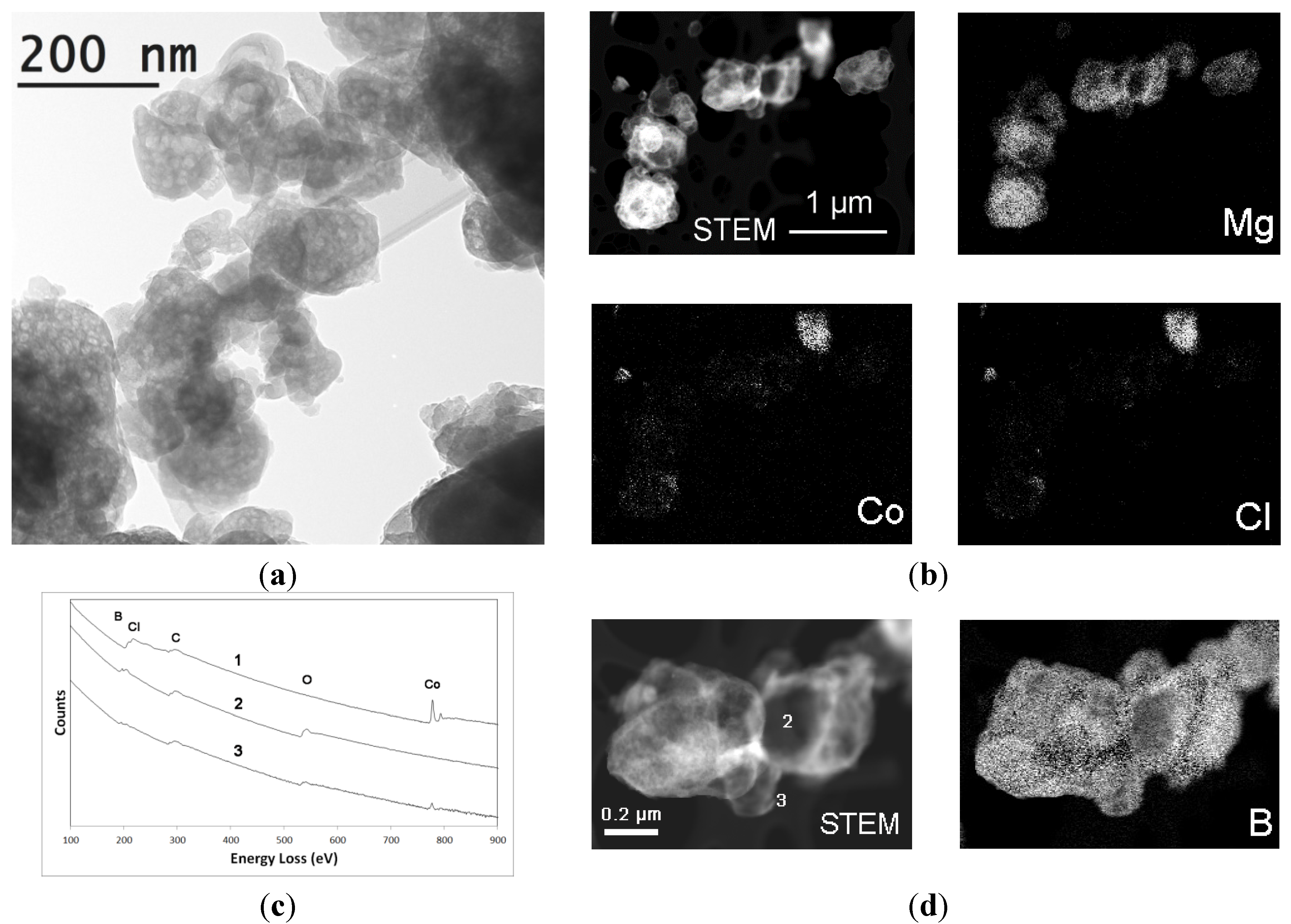 Spectrum 3 of Figure 5c was obtained from a small area at the particle surface. It shows the presence of Co, in addition to B and O, and relatively smaller amount of Cl, which suggests that a small amount of a chlorine-less phase of cobalt had formed at the particle surfaces during ball milling. In this way, TEM and SR-PXD analyses (Figure 4) show that most of CoCl2 additive did not react with the sample during ball-milling.