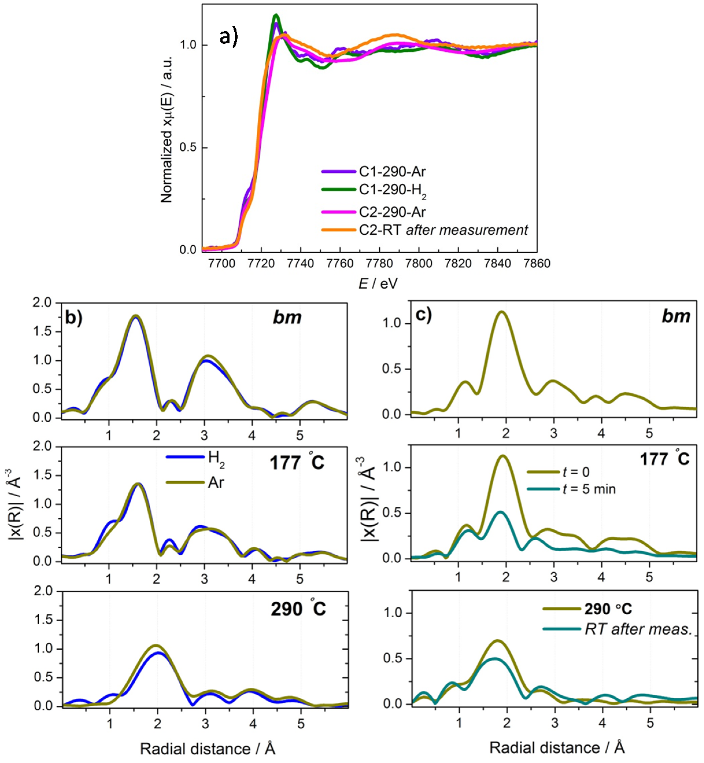 (a) Co K-edge XAS spectra of the C1 sample at 290 °C obtained in Ar (violet line) and H2 (green line) and XAS spectrum of C2 sample at 290 °C in Ar pink curve). The spectrum recorded after quenching C2 at RT is also reported for comparison (yellow line). Co K-edge k2-weighted FT-transform moduli of the EXAFS signals (phase-uncorrected) at different temperatures of (b) C1-H2 and C1-Ar and (c) C2-Ar.