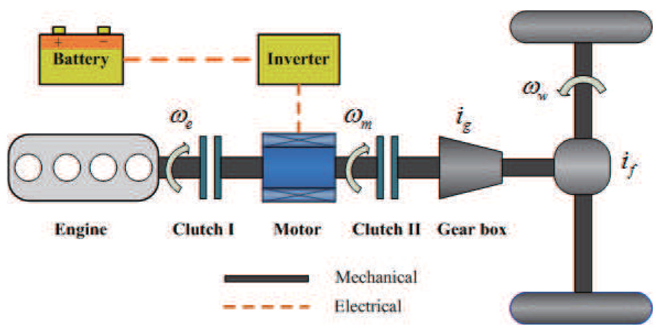 where and represent the gear ratios of the transmission and final gear, respectively. , and represent the rotational speeds of the wheel axle, engine and motor, respectively.