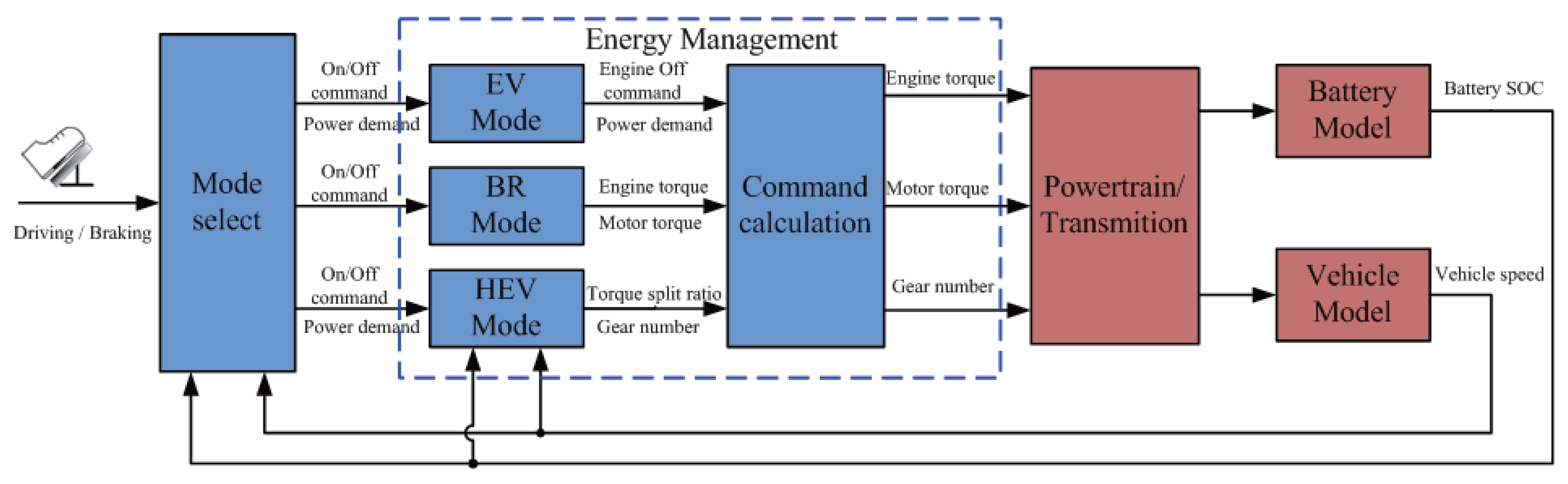 Figure 2 gives the schematic diagram of the vehicle control system. As shown in this figure, the control system of the PHEV consists of two major parts, the mode select block and the energy management block. The inputs of the mode select block are the driver’s intention (i.e., driving or braking) and the vehicle states ( i.e., the vehicle speed and the battery SOC). The outputs of the mode select block are the mode switching commands and the instant power demand, which interprets the driver’s accelerator or brake pedal position. Depending on these outputs, one of three different modes, i.e., EV mode, BR mode and HEV mode, is activated. The energy management block then outputs corresponding commands of the engine torque, motor torque and gear number to the powertrain and transmission. In the mode select part, the conditions for selecting different modes can be briefly explained as follows: If the battery SOC is below the maximum level and the vehicle is braking or the battery SOC is beyond the minimum level and the vehicle is starting, the EV mode is selected. If the SOC is too low, the mode select block will activates the BR mode. For normal driving circumstances, the HEV mode will be utilized.