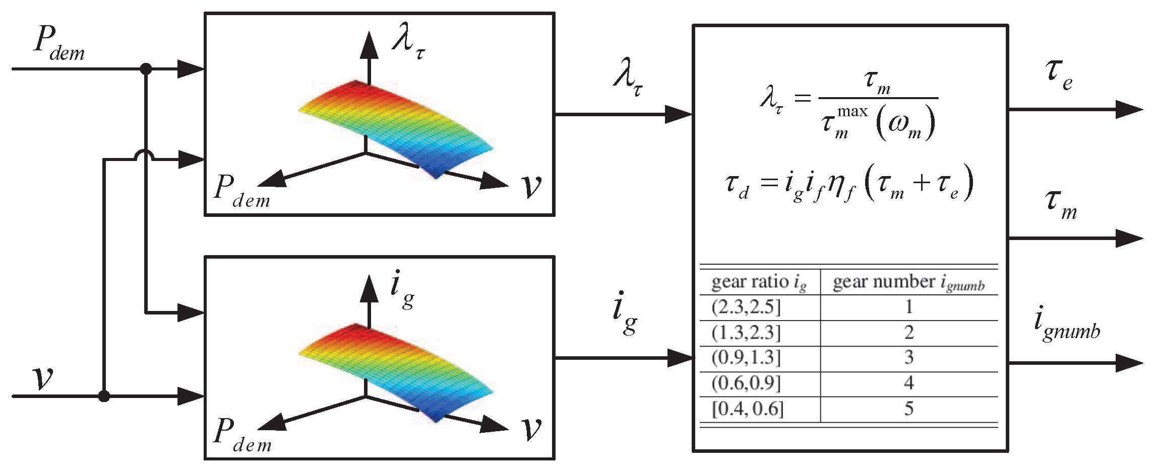 Figure 3 presents the schematic diagram of the power-split strategy. Based on instant power demand and vehicle speed v, the power distribution between the engine and motor is achieved by making appropriate decisions, i.e., torque-split ratio and gear ratio , from two given maps. Then, the torque-split ratio is converted to the corresponding demand torques of the engine and motor by the command calculation, and the gear ratio is converted to the discrete gear number by a piecewise converting table, as listed in Table 1.