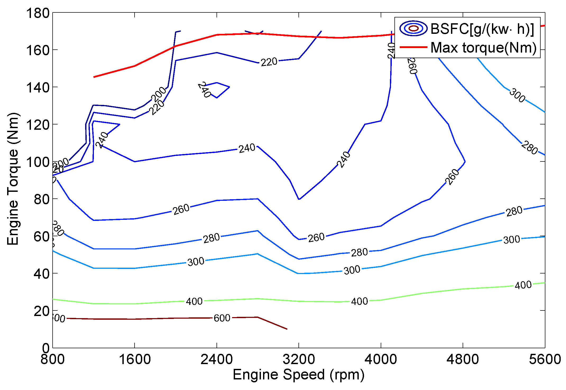 According to the BSFC map, the following polynomial is obtained to characterize the maximum engine torque depending on the engine speed.