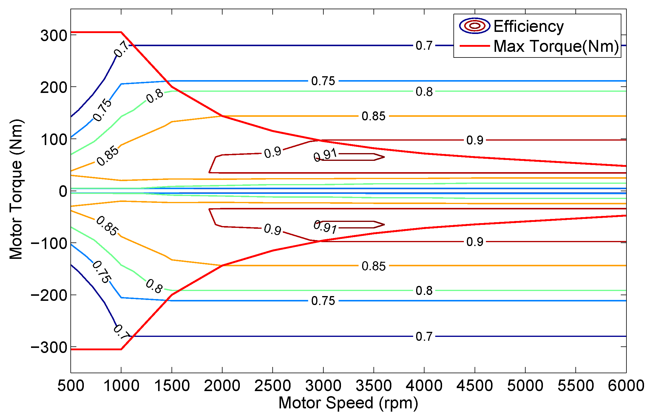 The efficiency map and torque characteristic curve of the electric machine are given in Figure 5.