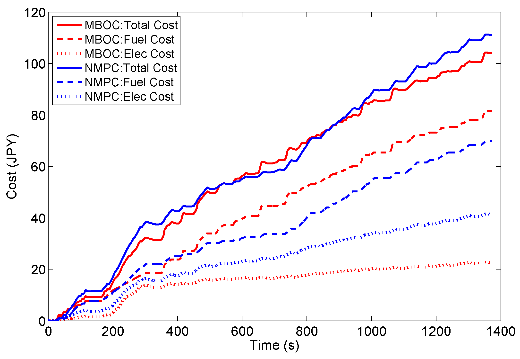 Figure 11 shows the fuel, electricity and total cost (the sum of electricity and fuel cost) under an appointed energy price ratio over this drive cycle. It can be observed that the MBOC strategy achieves less total energy cost for this trip compared to the NMPC strategy, despite the fuel cost being more. This benefit is evidently attributed to the greater savings of the electricity cost. Owing to less electricity energy being consumed in the MBOC strategy, the SOC therefore retains a higher value (0.757) at the end of the trip than that (0.638) in NMPC, as seen in Figure 12.