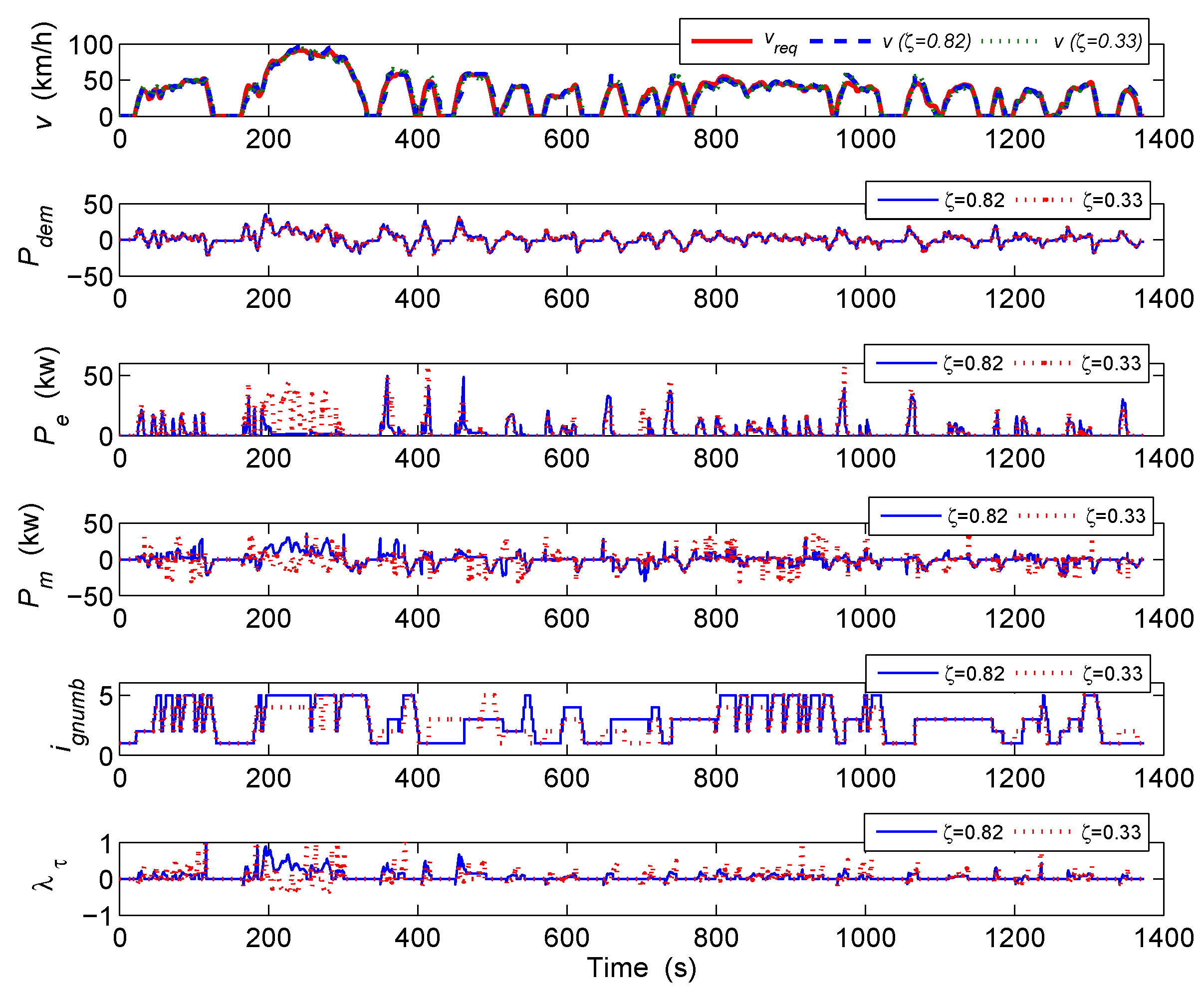 Vehicle speed, power demand, engine power, motor power, gear number and torque split ratio: ζ = 0.82 vs. ζ = 0.33.