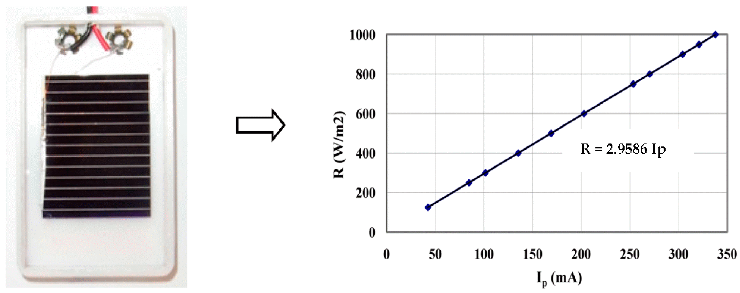 To measure irradiance R (W/m2), small, high-efficiency single-crystal silicon cells with the dimensions 3.5 cm × 5.5 cm are used. This radiation sensor delivers an electric current Ip (mA) proportional to the incident solar radiation, with accuracy close to 275 μA/Wm−2 (this changes depending on the device and has to be obtained during the calibration process).