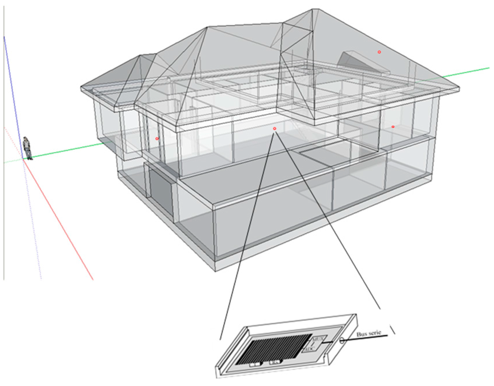 Given a building geometry, the control of passive systems, such as blinds and awnings, can be made by placing low-cost radiation sensors at different locations in the building as shown in Figure 2.