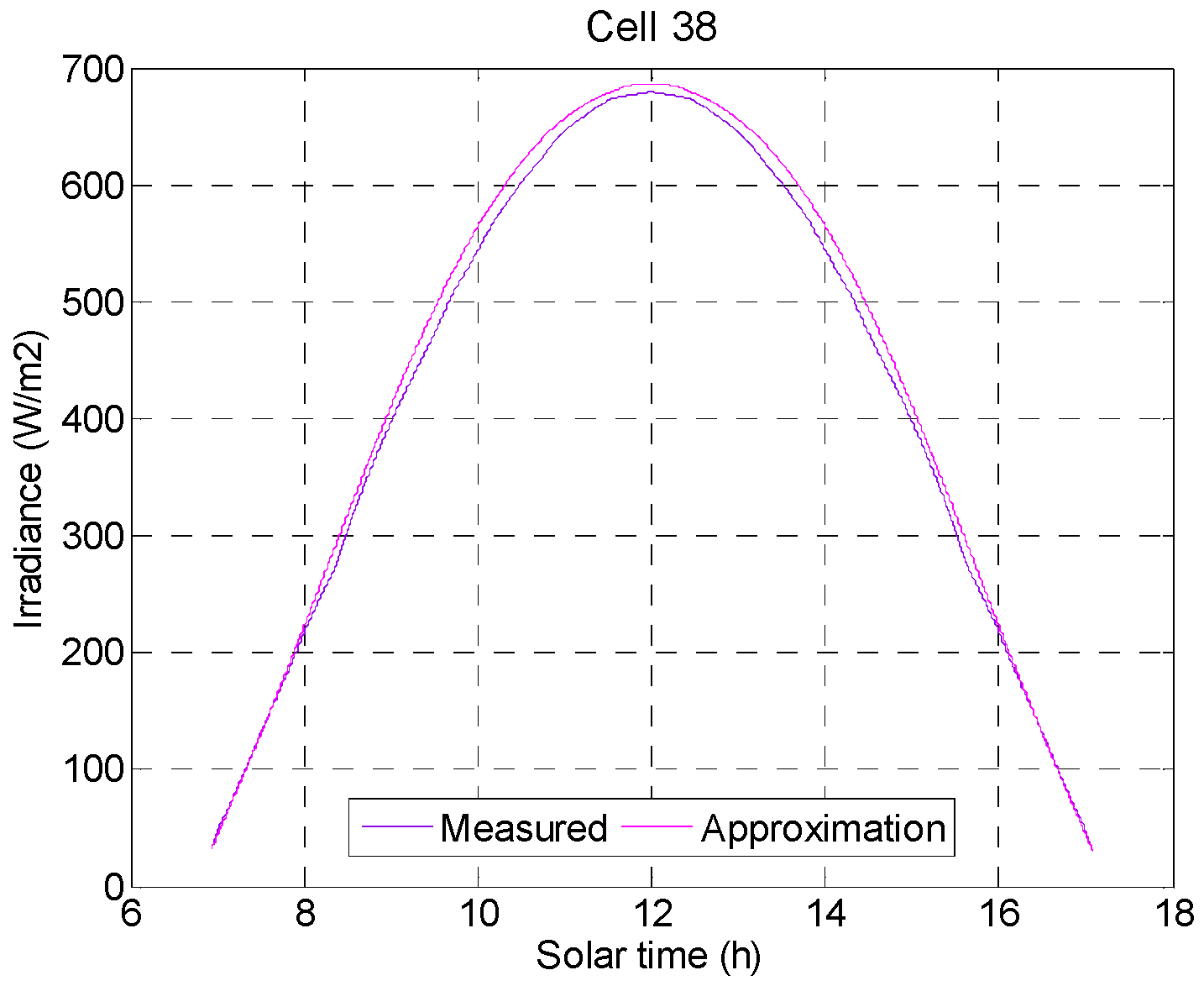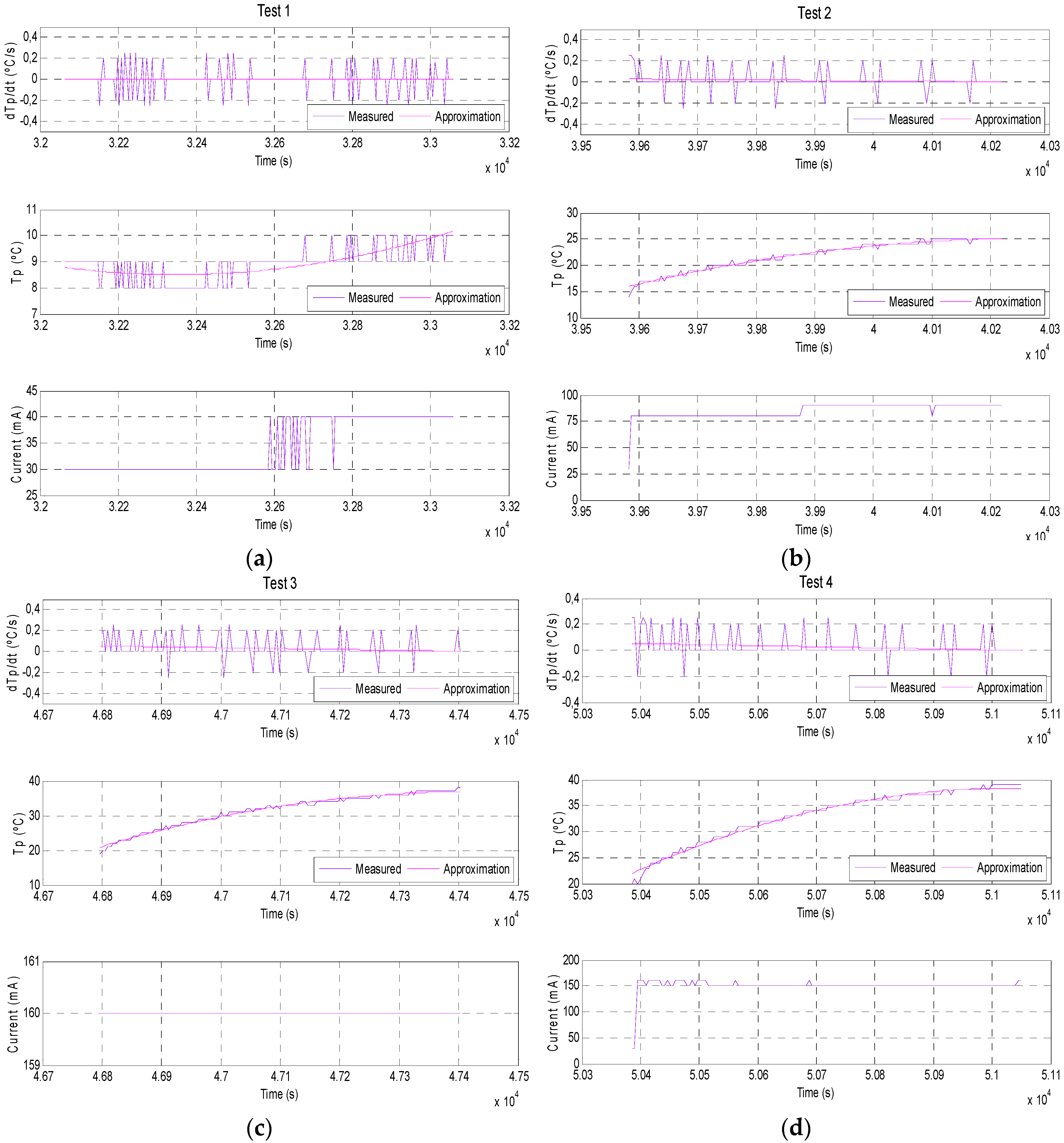 Quasi-stationary measurements performed on 2 February 2010 of electric current and cell temperature in one test is showed in Figure 4. The legend denoted “measured” is the irradiance measured by an independent calibrated sensor and the legend denoted “approximation” (corrected signal) refers to the irradiance calculated using the developed model. The natural irradiance suffers very little changes since each test lasts 10 min. The rate of temperature change can also be observed, obtained by differentiating the cell temperature.
