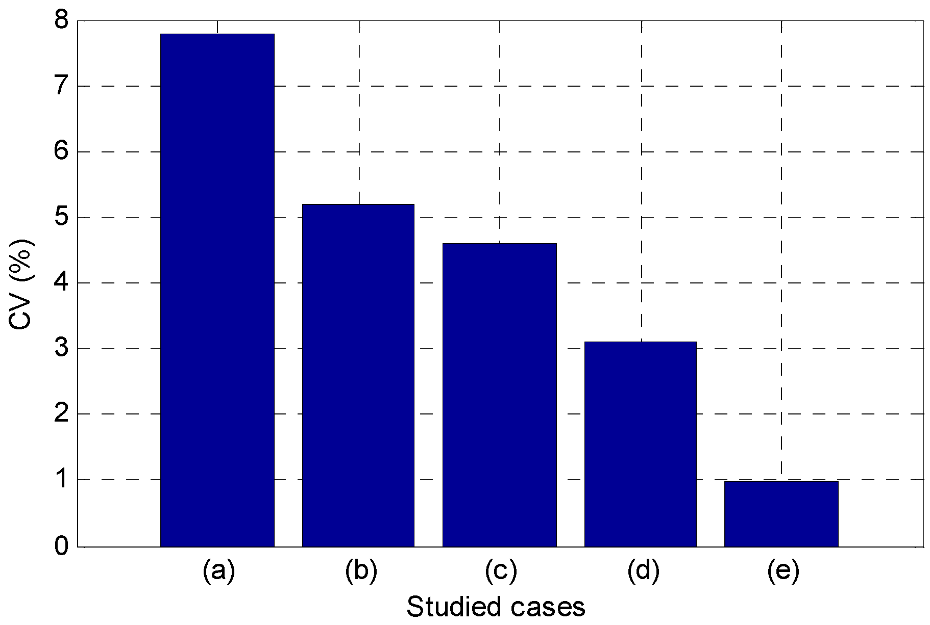 In Figure 8 the values of the CV (%) obtained for five proposed cases are represented as follows: (a) uncorrected signal; (b) corrected signal without ambient temperature and humidity; (c) corrected signal without ambient humidity; (d) corrected signal without ambient temperature; and (e) corrected signal.