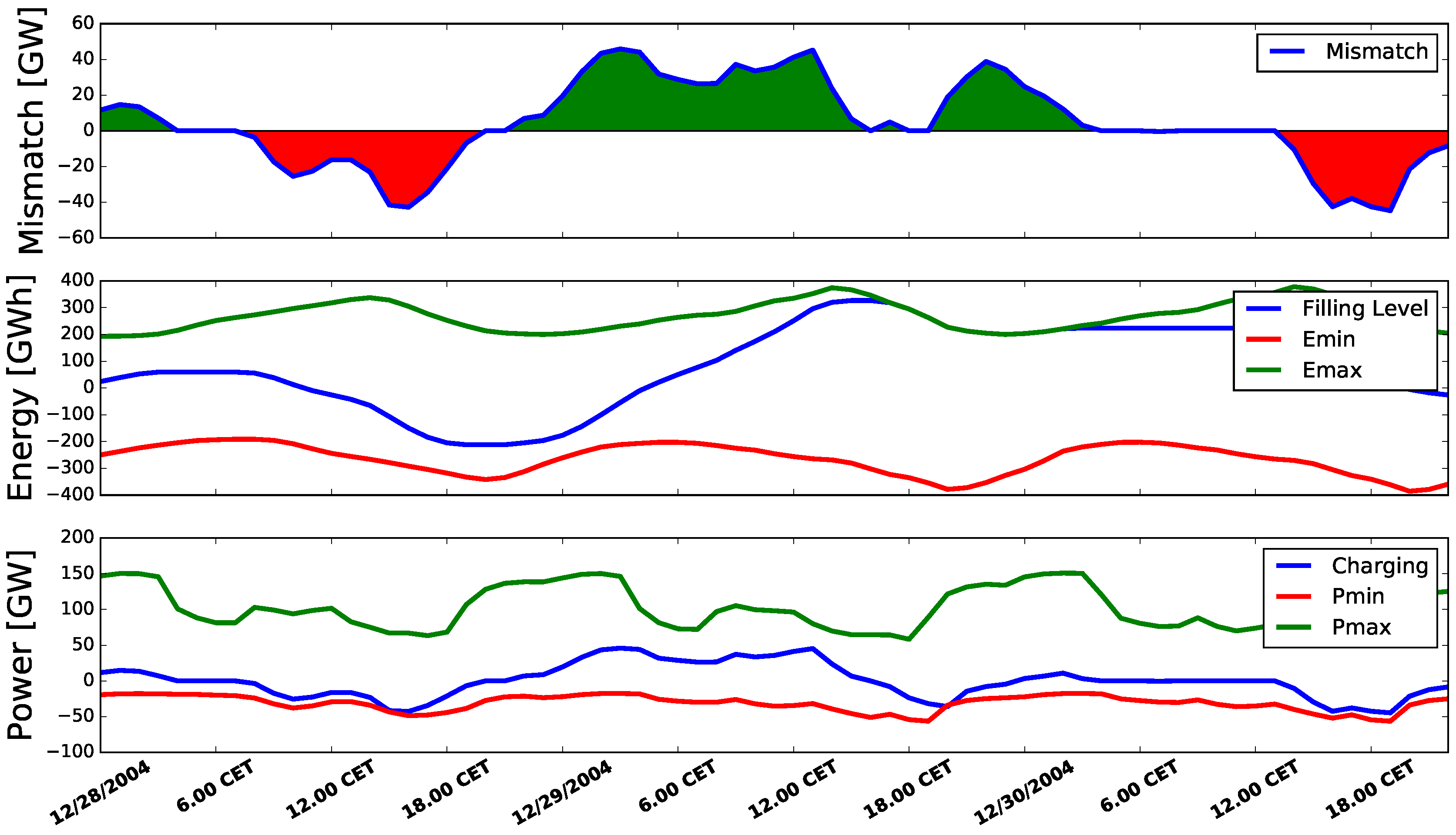 Mismatch (renewable generation-load-injection pattern), DSM filling level, and DSM charging rates for three exemplary days in Germany.