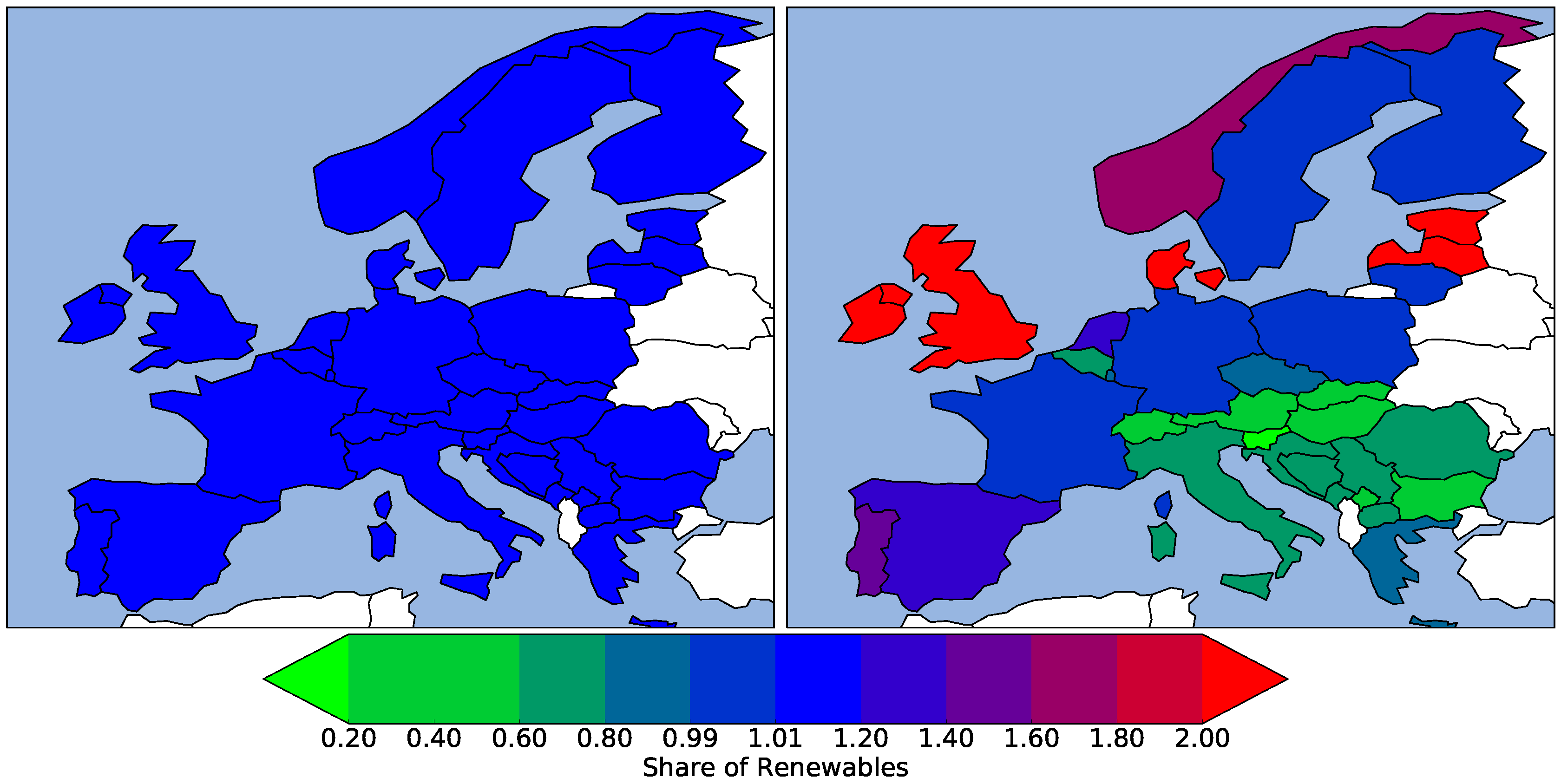 Shares of renewables (, average renewable generation over consumption) for single countries in the homogeneous (left) and inhomogeneous (right) scenarios.