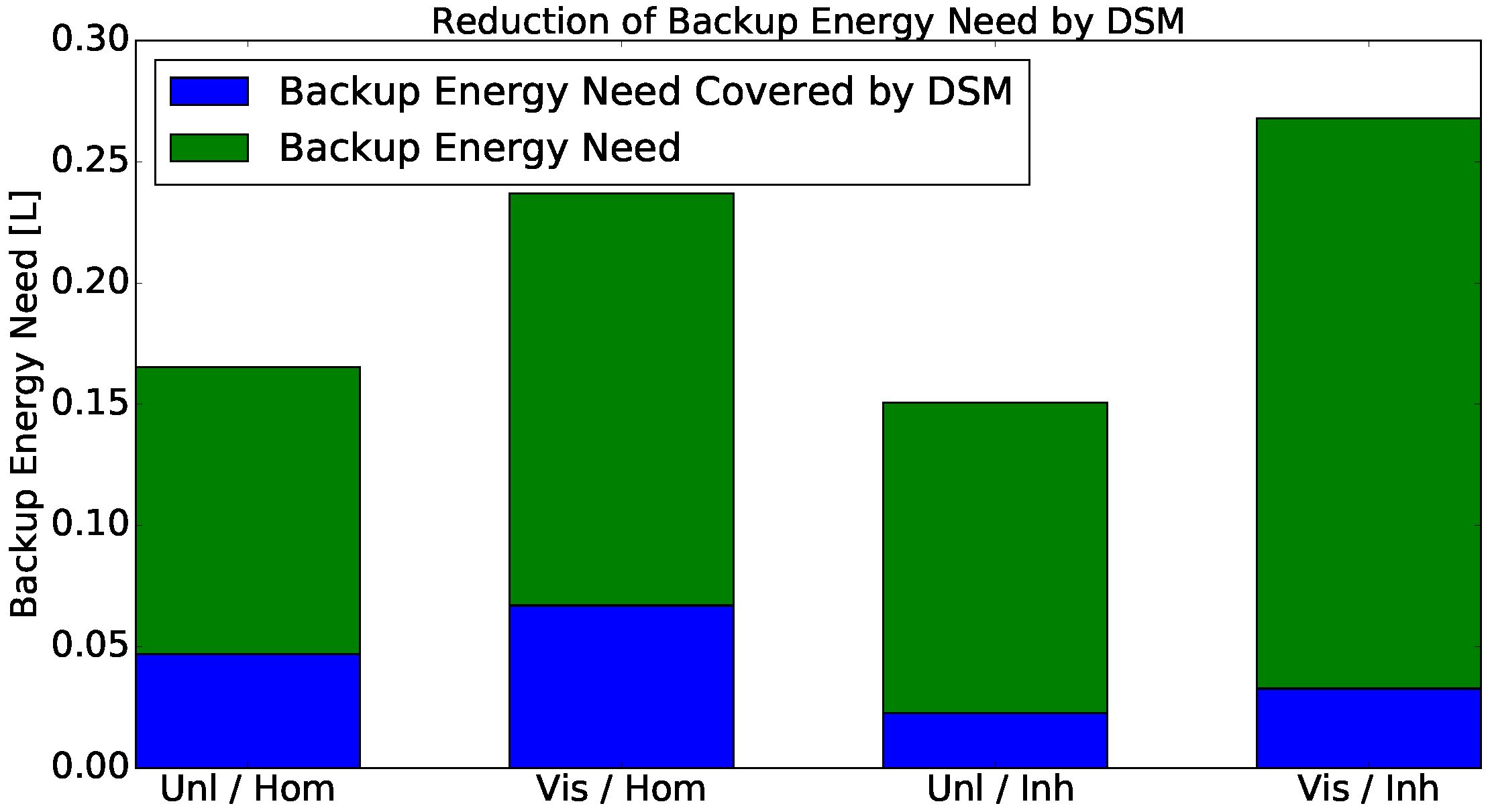 Need for backup energy and possible reduction by DSM. Entire bars show the need for backup energy without DSM. Blue components show the possible reduction by DSM. The backup energy need is measured in units of the overall consumption.