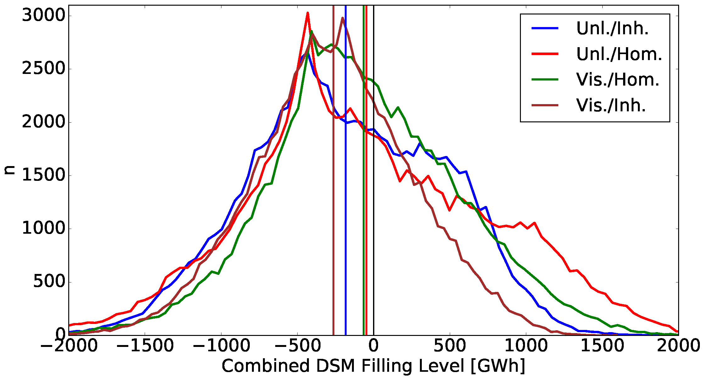 Frequency distribution of combined DSM storage filling levels. Vertical lines indicate the averages.