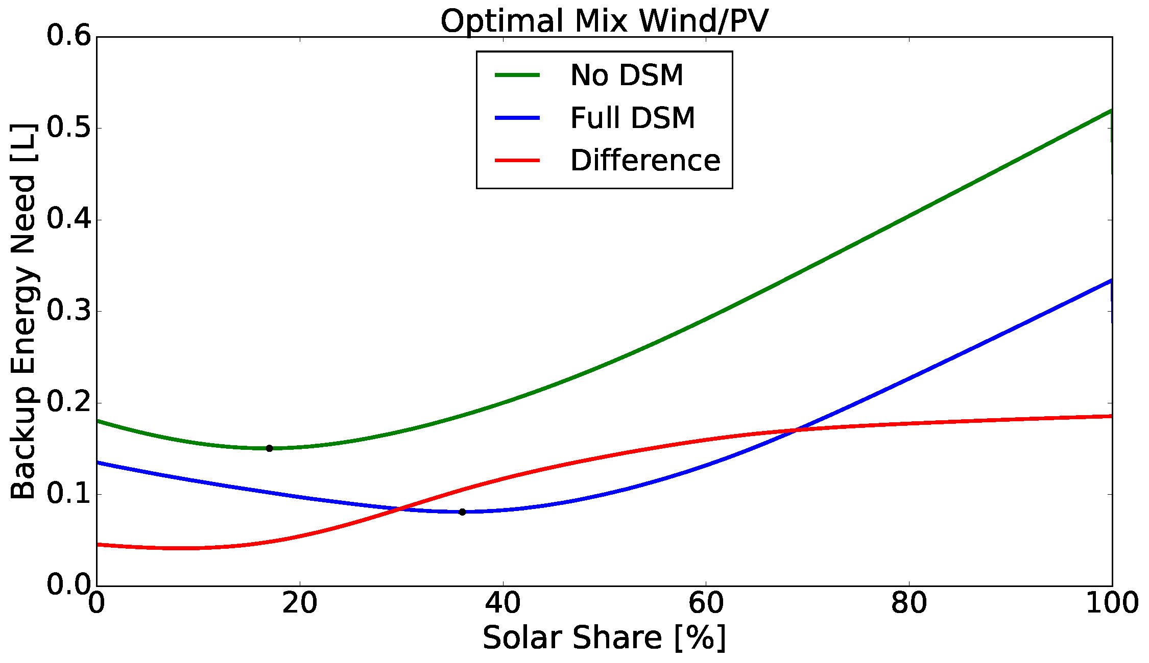 Backup energy need in dependency of the mix of wind and PV in Europe. Europe is treated like a copper plate. Black dots indicate the minima. The red line shows the difference between both curves. The backup energy need is measured in units of the overall consumption.