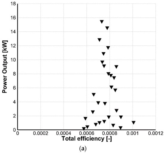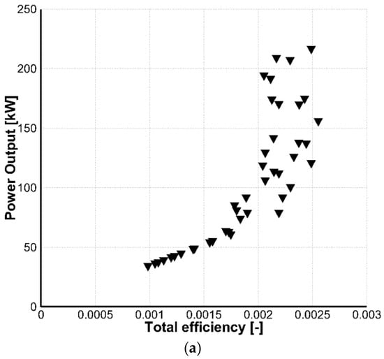 The final calculated three-dimensional (3-D) Pareto front for the Kerman power plant is shown in Figure 2. Thirty different non-inferior optimal configurations were found. Figure 3a,b and Figure 4 show corresponding 2-D solutions of the Pareto front. The tradeoff between the total efficiency and the power output for the Kerman SCPP is illustrated in Figure 3a. Correspondingly, Figure 3b shows the tradeoff between the total efficiency and the expenditure. The total efficiency of the Kerman SCPP with the existing configuration is estimated about 6.569 × 10−4. Figure 3b shows that, compared to the existing Kerman SCPP, the total efficiency of the majority of optimal points are relatively higher, however, the total efficiency still remains low.