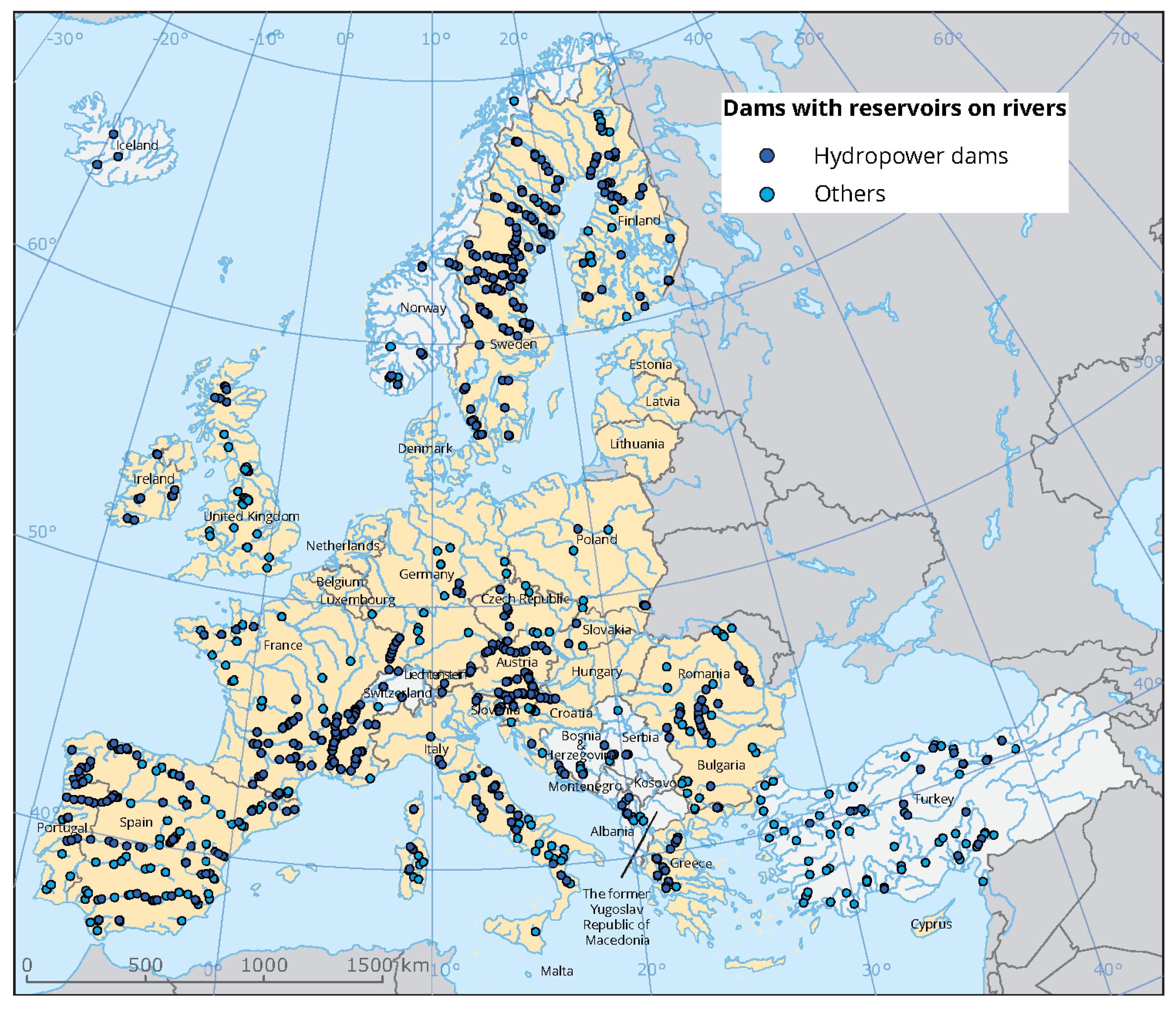 Dams on larger rivers in Europe. Hydropower stations and non-powered dams (NPDs). Source: European Environment Agency (EEA). Available online at: http://www.eea.europa.eu/.