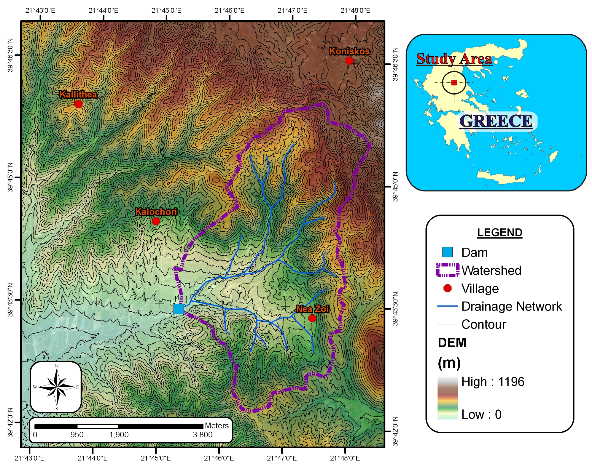 The study site: watershed, rivulet network, digital elevation model (DEM), dam and consumption points (villages).