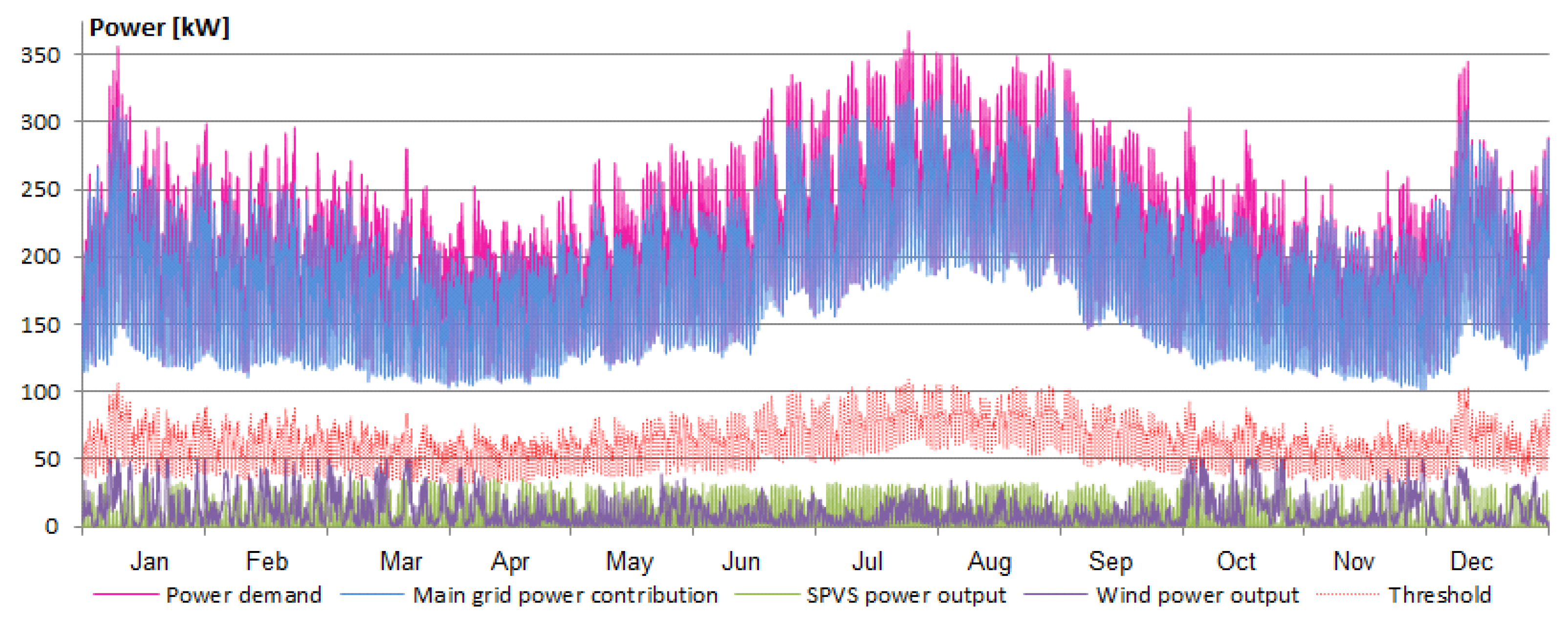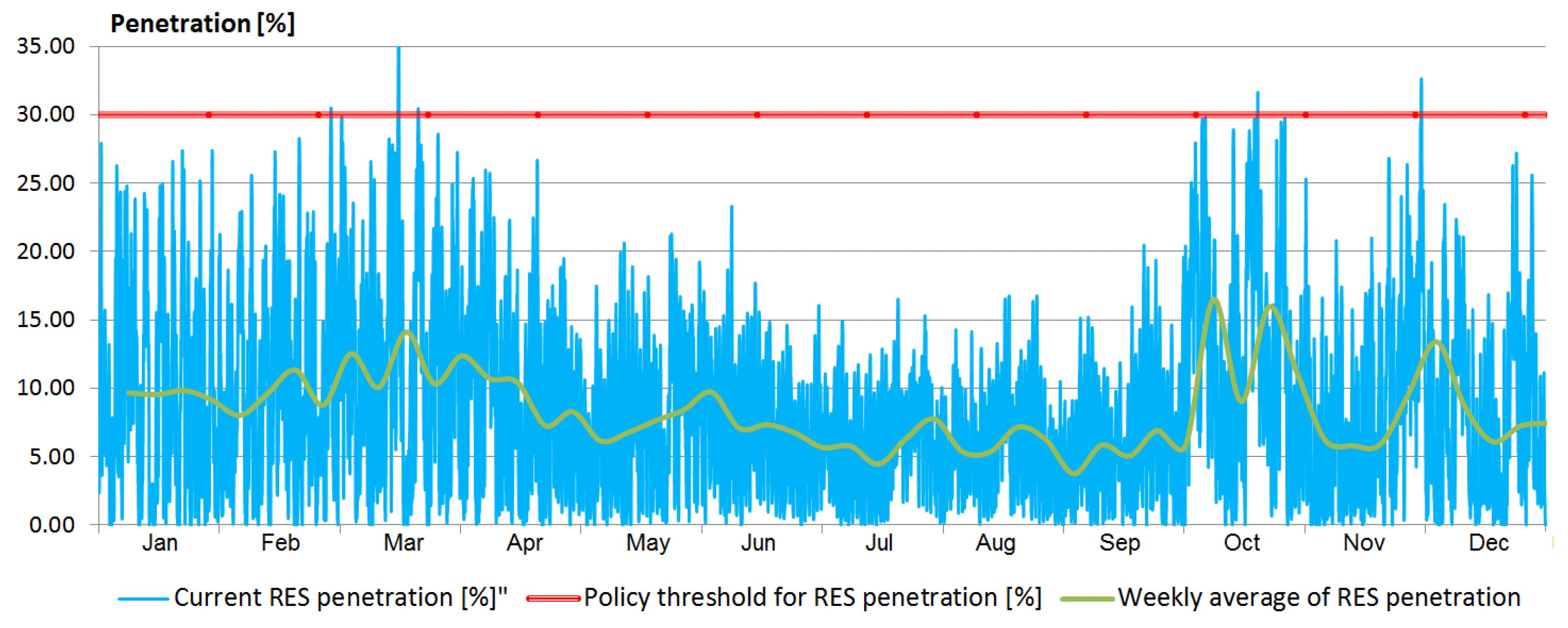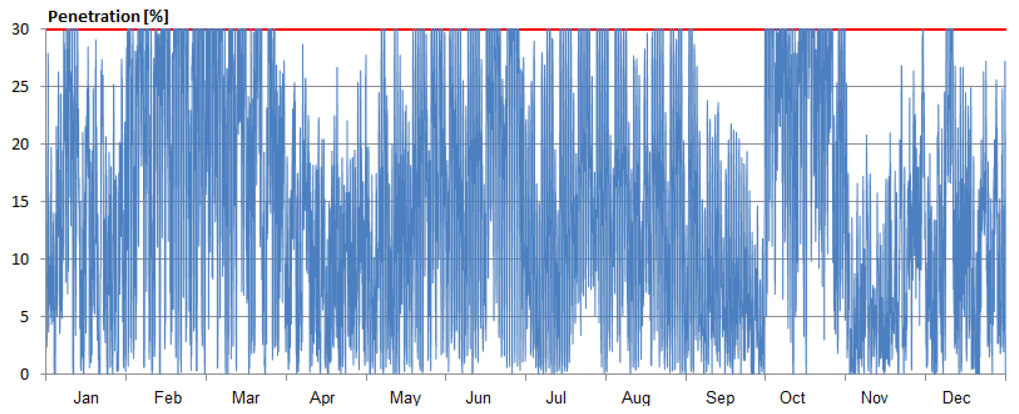 However, additional power capacities of RES cannot be connected without increasing the amounts of spilled energy. Currently, the installed RES need to be disconnected on a few occasions every year, due to excess of the 30% threshold. Thus, although clean technologies currently cover only a fraction of the demand, it is not possible to increase their capacities without spilling significant amounts of their power. This situation is illustrated in Figure 4, where a visualization of the collected data shows that in some occasions throughout the year, output of local RES exceeds the threshold. These occasions appear exclusively in the first and last quarter of the year, which is the period between October and the end of March.
