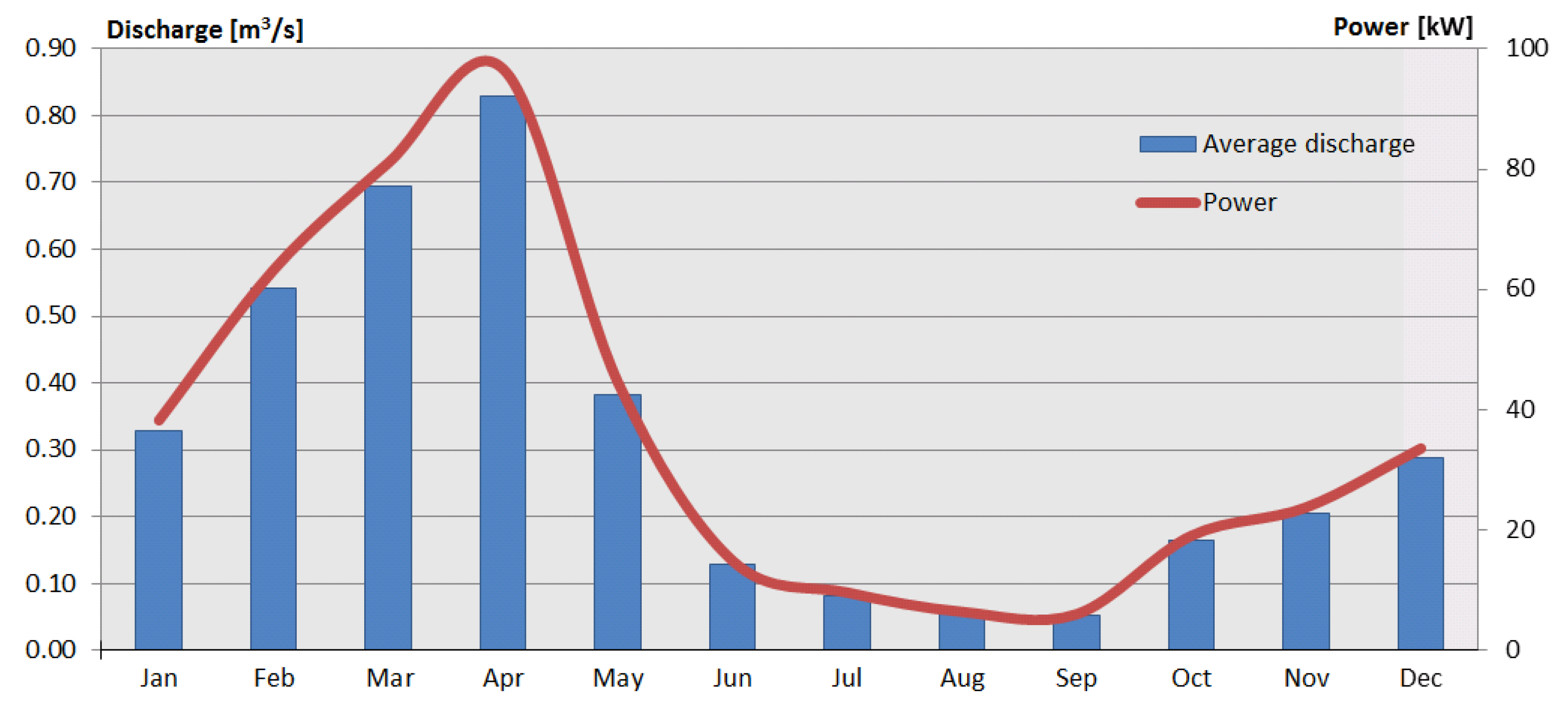 The maximum dam height is 32 m, and its transformation to a hydropower station is expected to result in a hydroelectric facility with a lower hydraulic head. Using Equation (1), the available hydropower potential is estimated at approximately 100 kW. The red line in Figure 5 shows the average available power for every month, assuming a non-regulated run-of-river operation without reservoir management operations. Since all the factors of Equation (1) are either constant or have only small variations throughout the year (H), the maximum expected power (96.6 kW) appears in April, when average river flow reaches its maximum value.