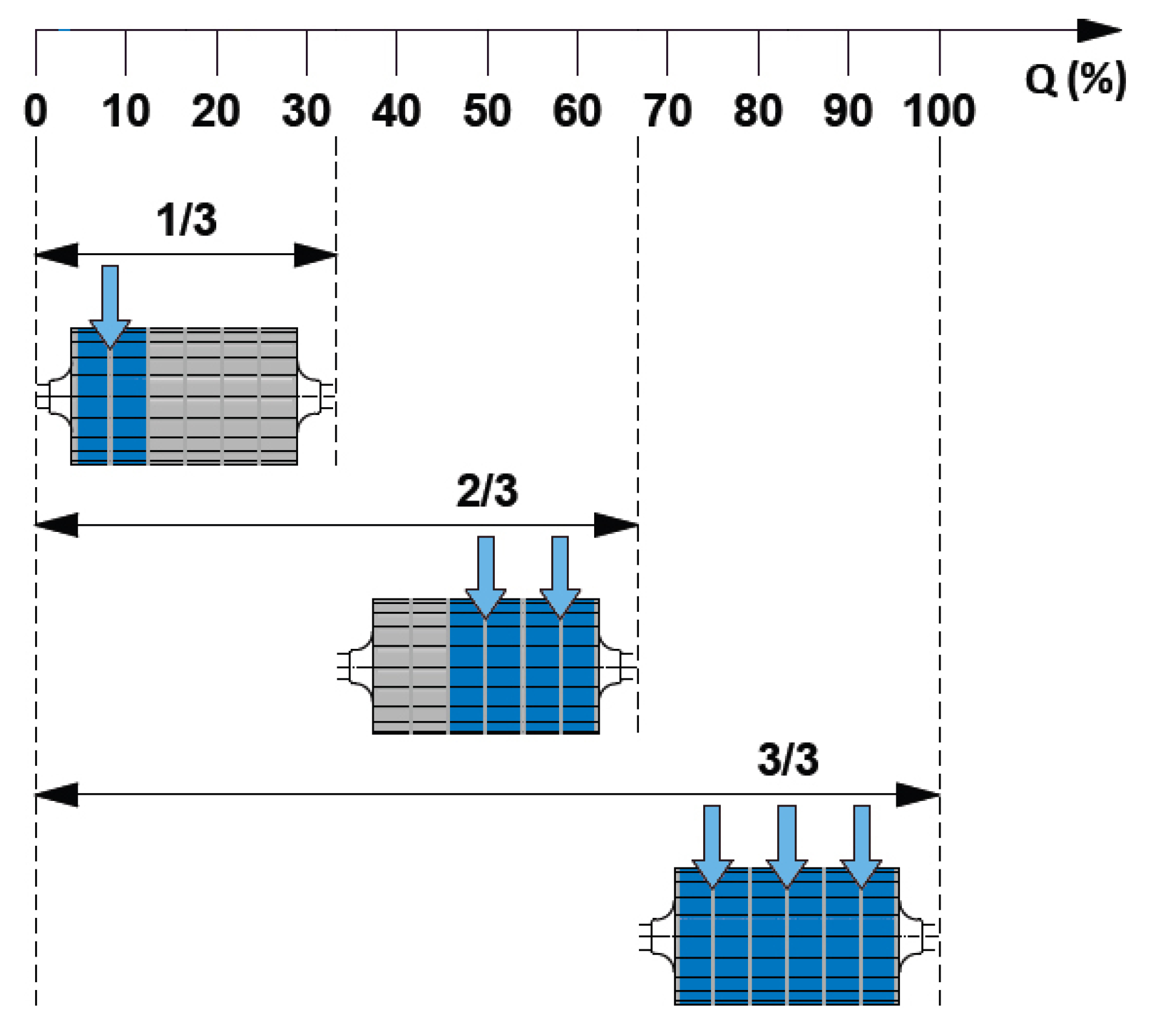 In order to utilize the available potential, a 100 kW turbine was selected. Cross-flow turbine type is the most suitable for this combination of discharge and hydraulic head [30]. Partitioned cross-flow turbines allow increased efficiency, even when the flow is less than 25% of the design flow. As shown in Figure 6, cross-flow turbines operate efficiently under different flow conditions using the arrangement for flow portioning. This unique characteristic is particularly useful in the present study, due to the average low summer flow.