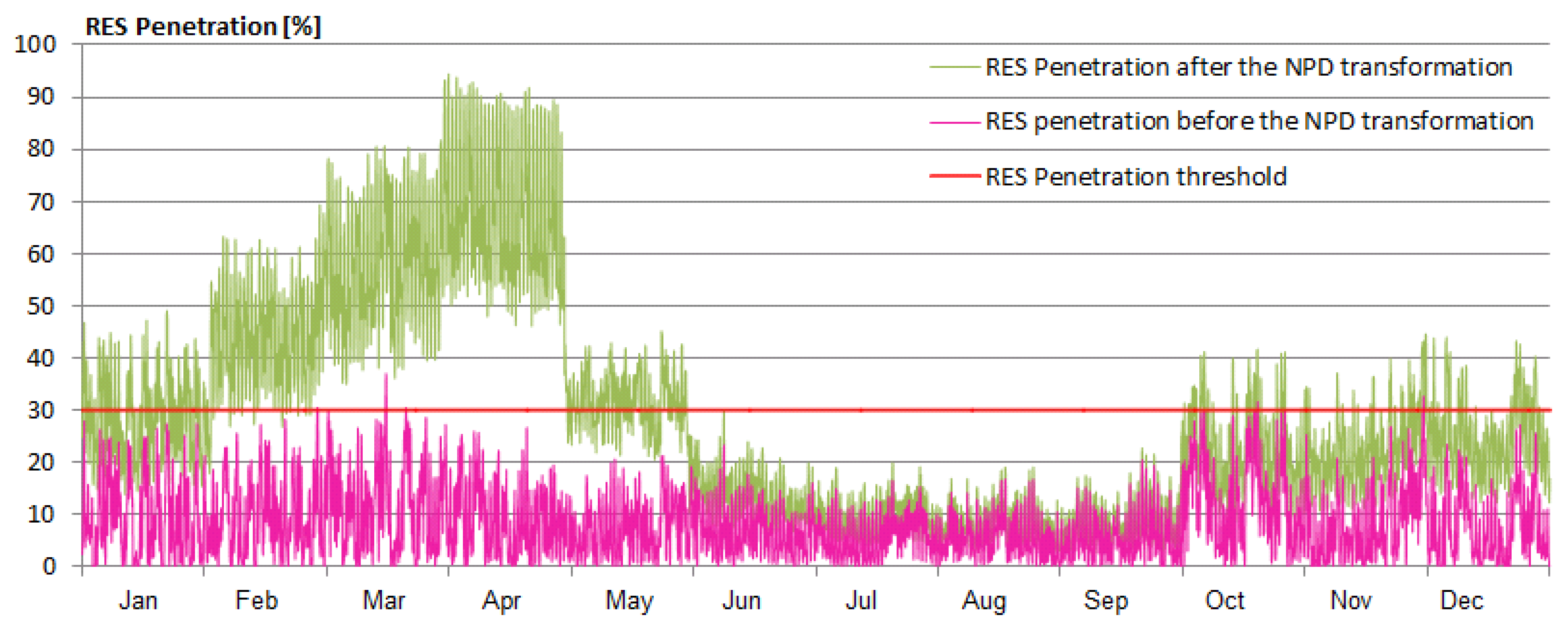 The penetration of total RES also increases with the proposed method. Thus, while 8.4% of the total consumption was based on RES, the NPD transformation almost doubles this percentage, resulting in 15% of RES penetration. This increase is illustrated in Figure 9, where it is obvious that the “valleys” of the RES penetration have been smoothed, and the “peak shaving” was effective.