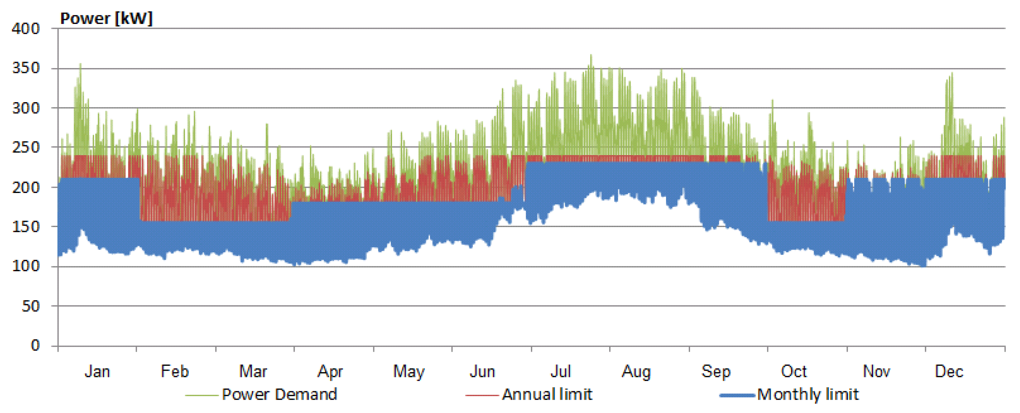 In the second step, the maximum contribution from the main grid is determined on a monthly basis. Average monthly consumption can be divided in four categories, ranging from very low to very high. Each category contains three months, as shown in the following Table 1. Accordingly, monthly limits on the grid contribution (Figure 8, in blue) increase the RES potential further (difference between green and blue).
