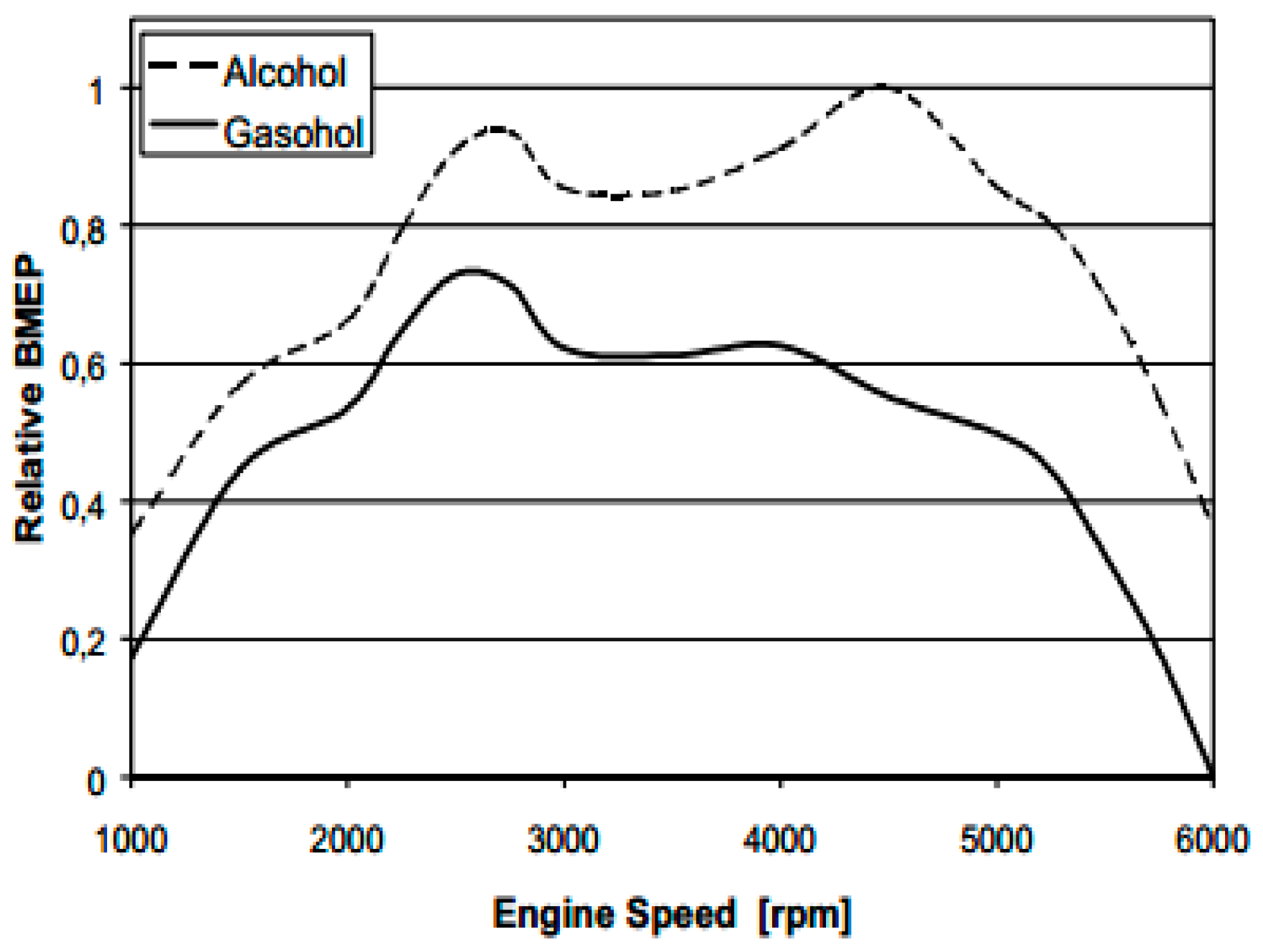 Experimental work carried out by Schifter et al. [6] investigated the effect of using gasoline‑ethanol mid-level blends (10%–40% anhydrous or hydrous (4% water content in ethanol)), in a single-cylinder SI engine. The results showed that higher pressures and lower intake manifold temperatures were obtained with the use of hydrous ethanol blends in comparison with the use of anhydrous ethanol blends and led to increased volumetric efficiency. Furthermore, hydrous ethanol blended gasoline decreased the combustion speed, combustion duration, and the heat release rate. In addition, the results revealed an increase in the indicated mean effective pressure (IMEP) for hydrous ethanol blends over anhydrous ethanol blends. For rich air-fuel ratios, the use of hydrous ethanol results in higher power outputs than anhydrous ethanol. Moreover, the fuel consumption by mass slightly increased using the hydrous ethanol. In the work of Clemente et al. [8], the peak torque and peak power for hydrous ethanol (7% water concentration) was enhanced by 9% and 14% respectively in comparison with the blend of gasohol (22% ethanol and 78% gasoline). The increase in peak torque and peak power output for hydrous ethanol is related to one reason, hydrous ethanol allows working with more advanced ignition points aiming for maximum brake torque (MBT) conditions, so a mixture with 78% gasoline was knock limited, while hydrous ethanol worked at the MBT operation point. The authors also described that the specific fuel consumption for hydrous ethanol was increased by 35% compared with the E22 fuel, because hydrous ethanol has a lower heating value than E22, with the brake mean effective pressure (BMEP) also being enhanced for hydrous ethanol (see Figure 1).