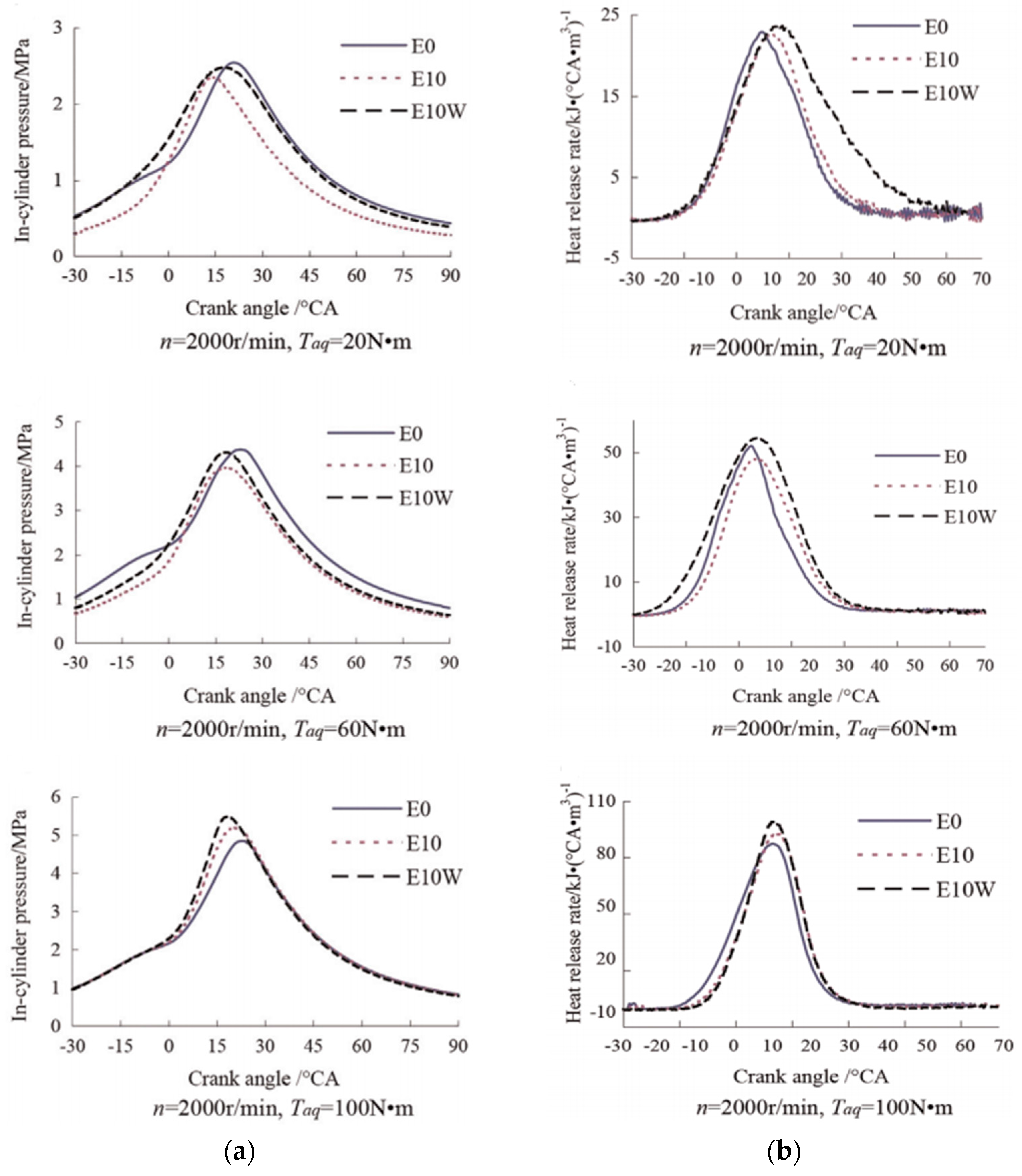 The variation of (a) in-cylinder pressure (b) heat release rate with crank angle for a fixed speed of 2000 rpm, and engine torque of 20 Nm, 60 Nm, and 100 Nm. (E0 = 0% ethanol & 100% gasoline, E10W = HE10 = 10% hydrous ethanol & 90% gasoline, E10 = 10% ethanol & 90% gasoline) [38]. Copyright (2015) Elsevier Ltd.
