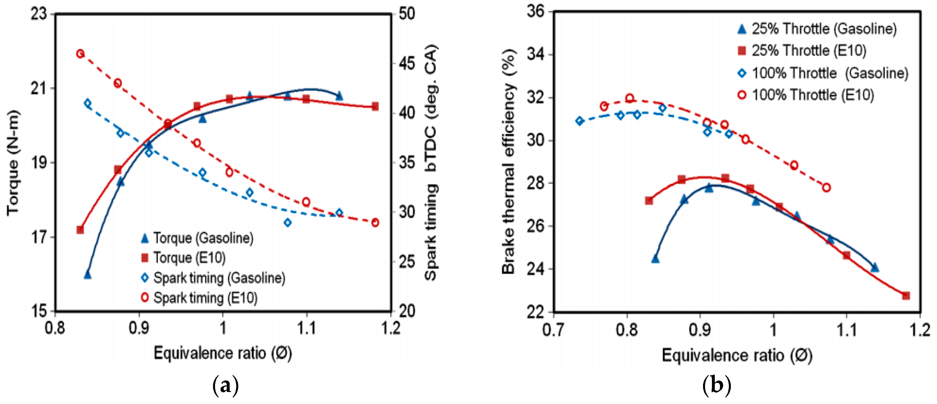- Koç, M.; Sekmen, Y.; Topgül, T.; Yücesu, H.S. The effects of ethanol‑unleaded gasoline blends on engine performance and exhaust emissions in a spark-ignition engine. Renew. Energy 2009, 34, 2101–2106. [Google Scholar] [CrossRef]