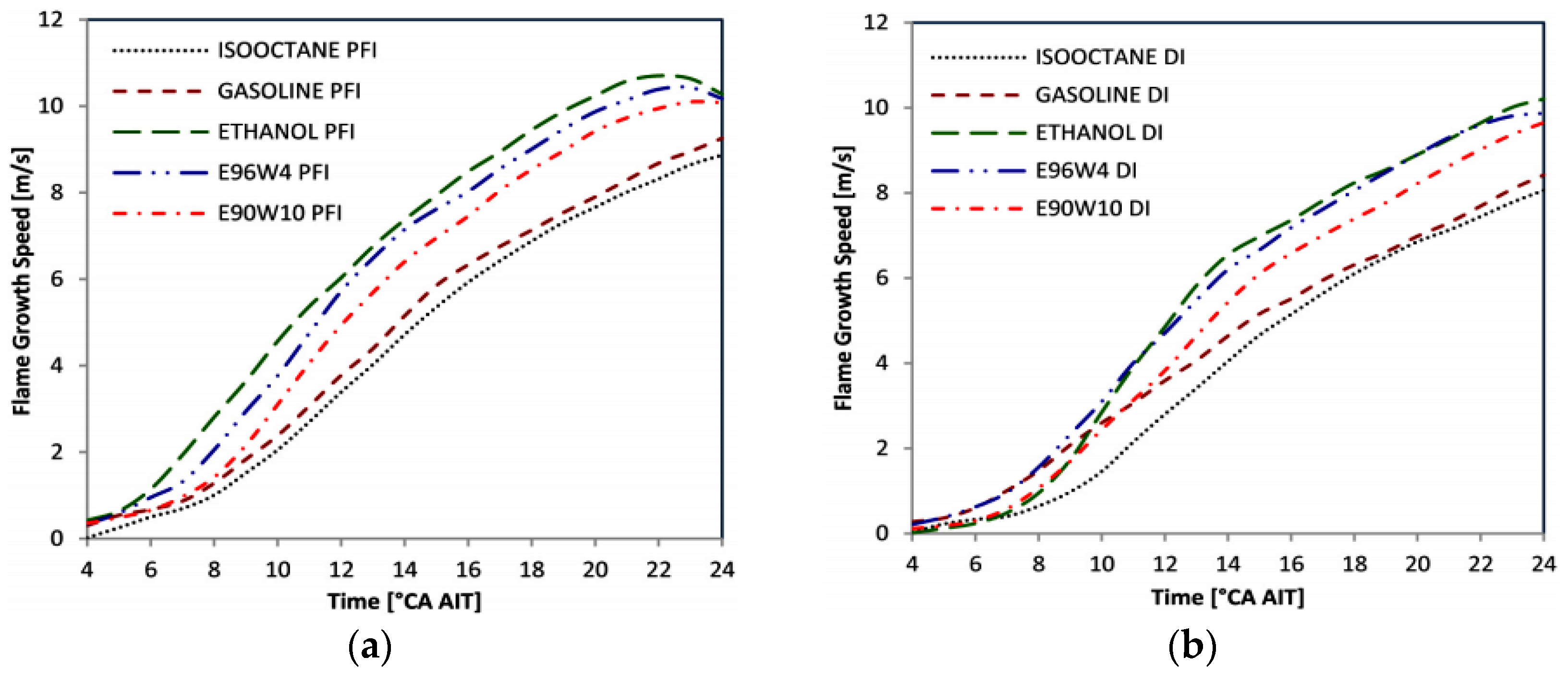 Flame growth speed for (a) PFI and (b) DI operation, for the first 24° CA of combustion at a fixed engine speed of 1000 rpm and an equivalence ratio 1. Reprinted with permission from Ref. [68]. Copyright (2014) SAE International.